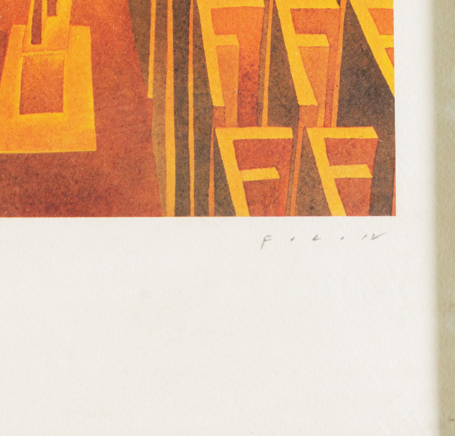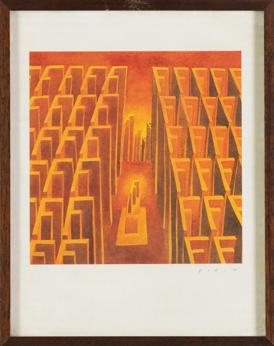 Jean-Michel Folon (Uccle 1934 - Principato di Monaco 2005), “Lettera F” per la serie “L’Alfabeto”, 1972. - Fotolitografia a colori su carta a cura di Bolaffi Arte, firmata in basso a destra, reca in basso a sinistra timbro a secco “Bolaffi Arte”, reca al retro numerazione 2616/5000, Lastra H cm 19x19