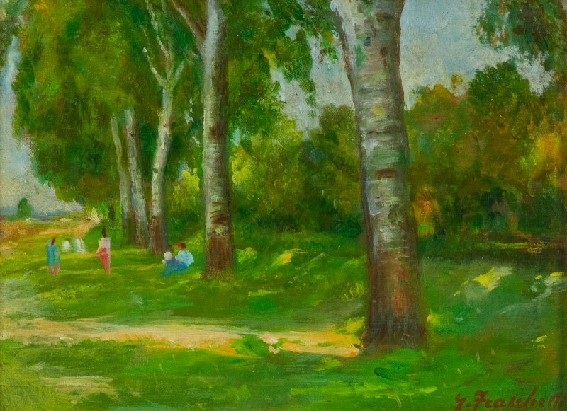 Giuseppe Fraschetti (Firenze 1879 - 1956) LE CASCINE Olio su tavola, cm. 21x28 Firmato in basso a destra. Sul verso: firma.