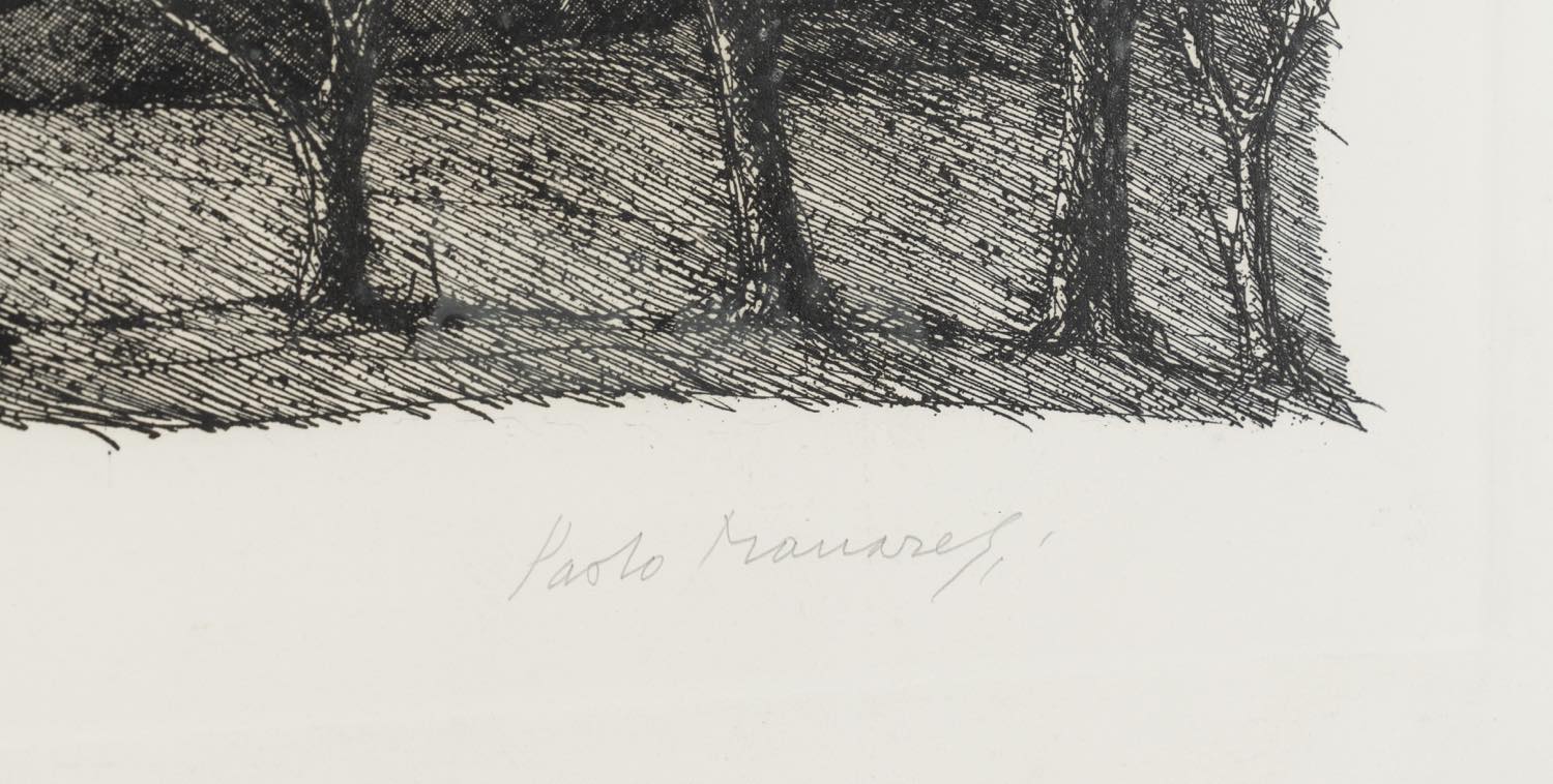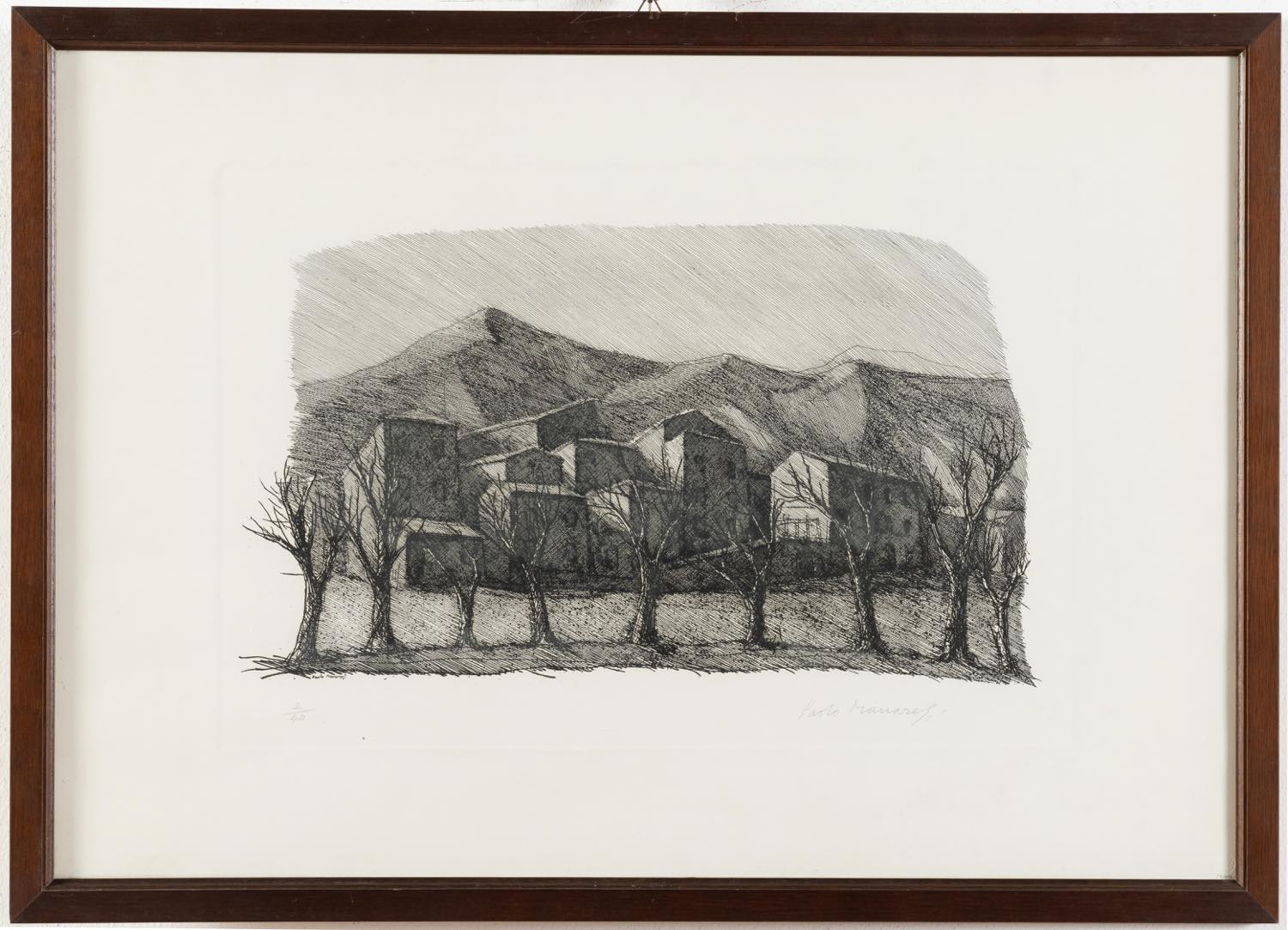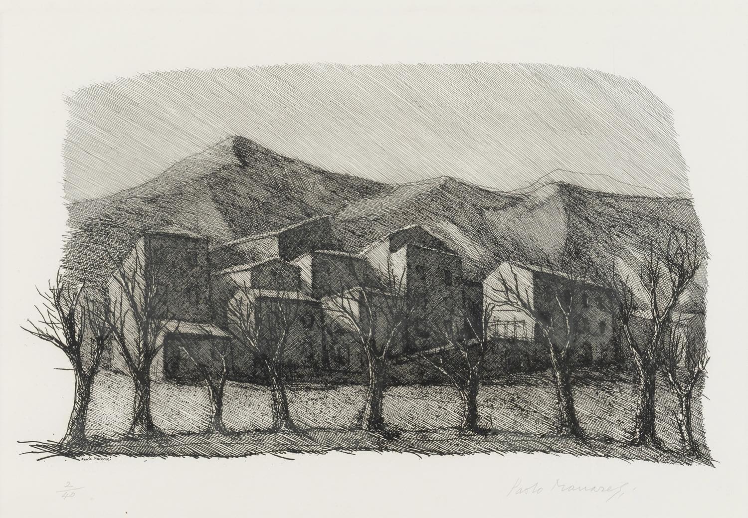 Paolo Manaresi (Bologna 1908 - 1991), “Paesaggio”. - Incisione su carta, firmata sulla lastra in basso a sinistra e sul foglio in basso a destra, numero di tiratura in basso a sinistra 2/40, H cm 33.5x49