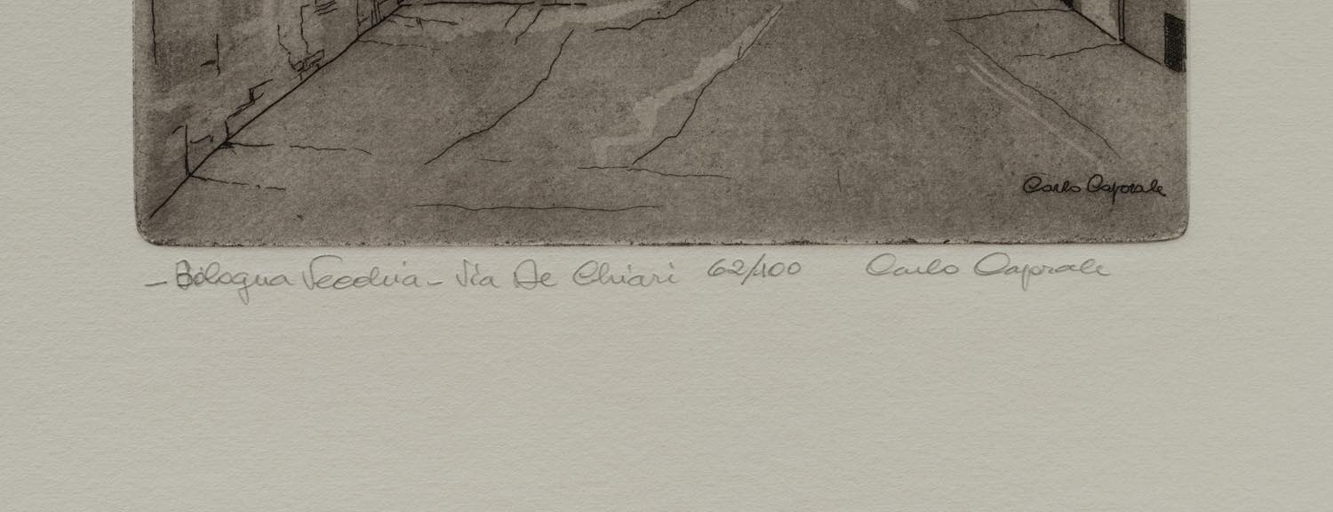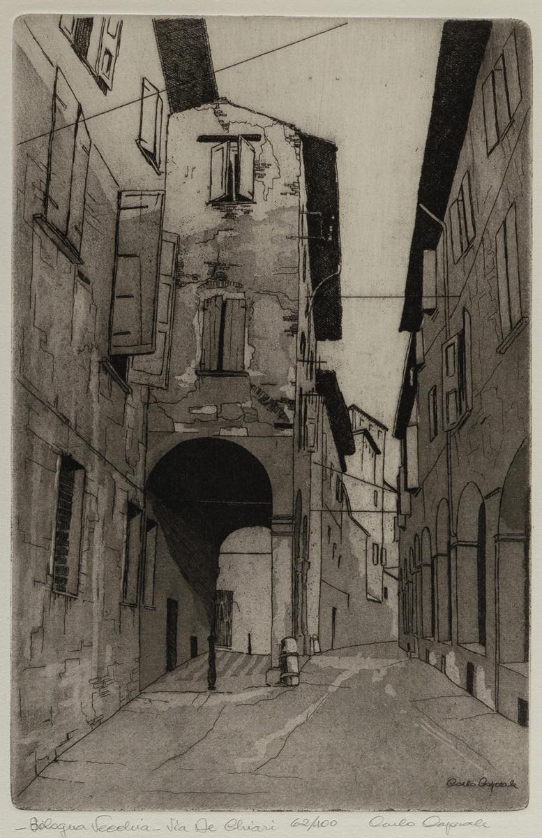 Carlo Caporale (San Giovanni in Persiceto 1923 - San Benedetto in Val di Sambro 2000), “Bologna vecchia: via De Chiari”. - Acquaforte su carta, firmata in basso a destra, reca titolo in basso a sinistra e numero di tiratura in basso al centro 62/100, Lastra H cm 28x18