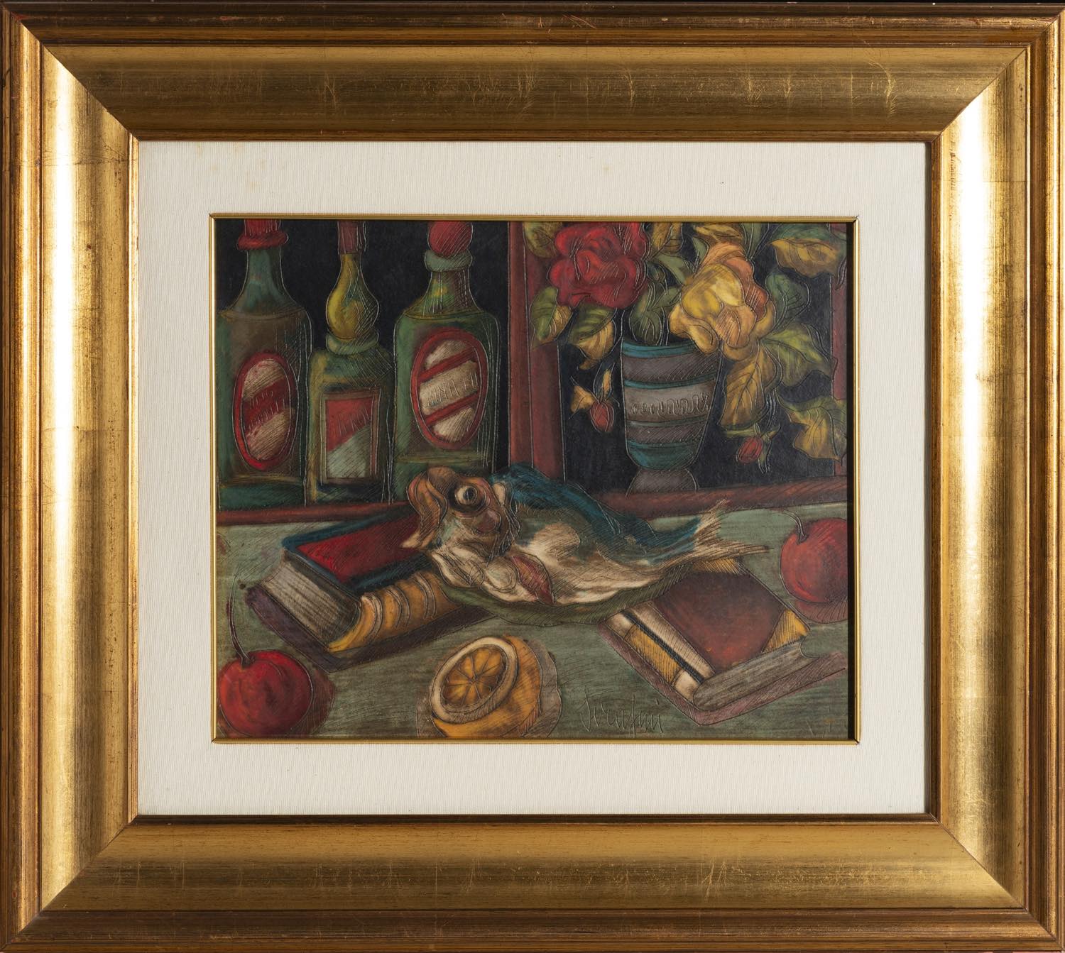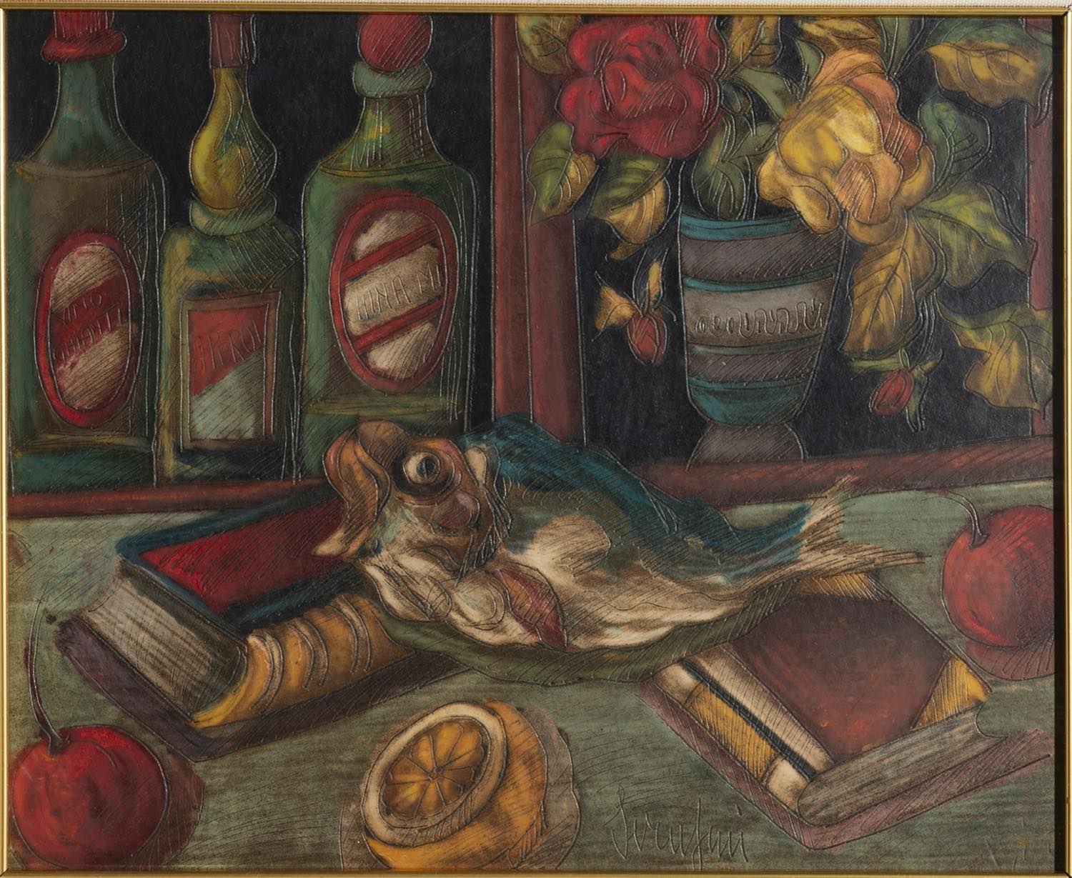 Giuseppe Serafini (Montelupo Fiorentino 1915 – 1987), “Natura morta”. - Olio e tecnica mista su cartone, firmato in basso al centro, reca al retro titolo e firma, H cm 31x37.5