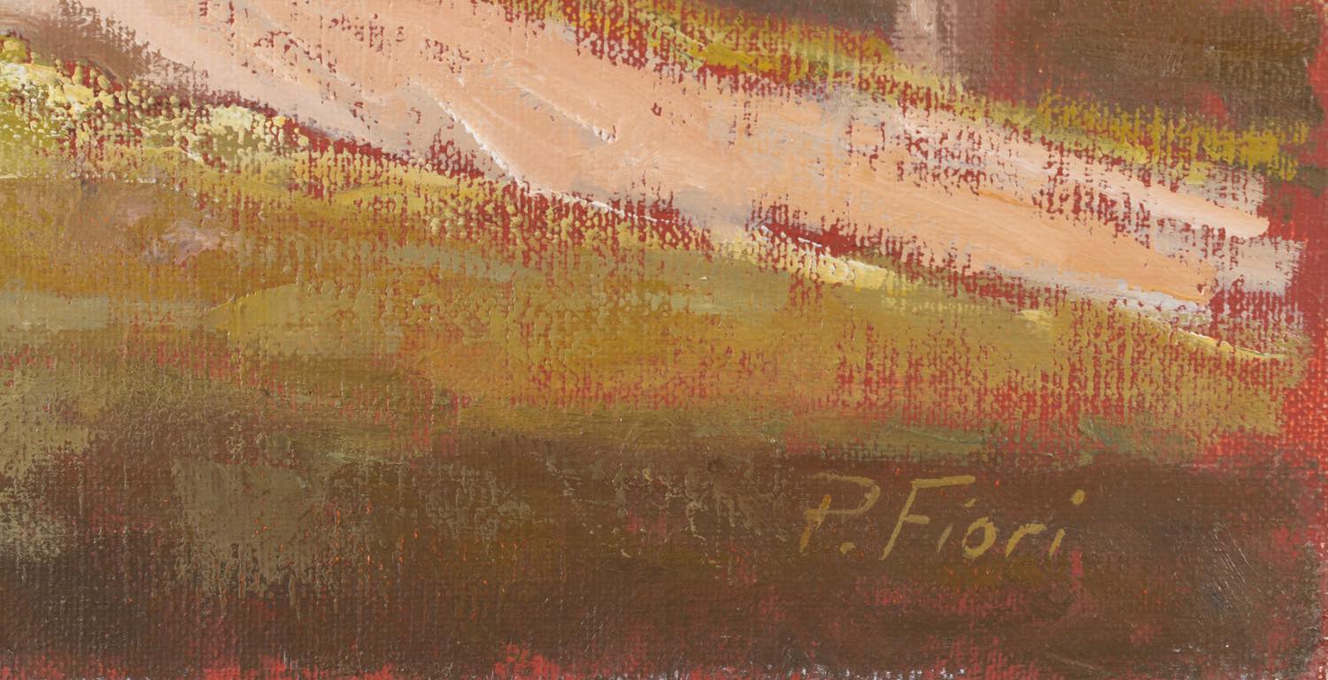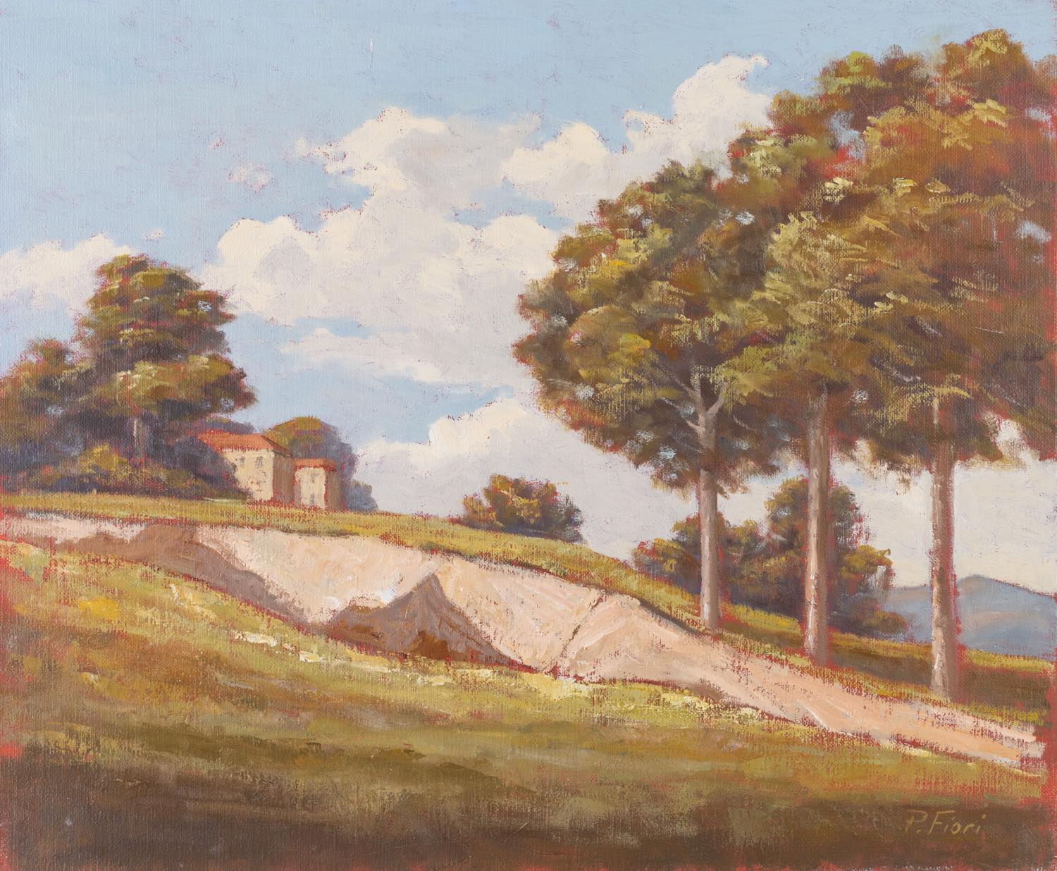 Piero Fiori (Bologna 1947), “Paesaggio con case”. - Olio su tela, firmato in basso a destra, H cm 50x60