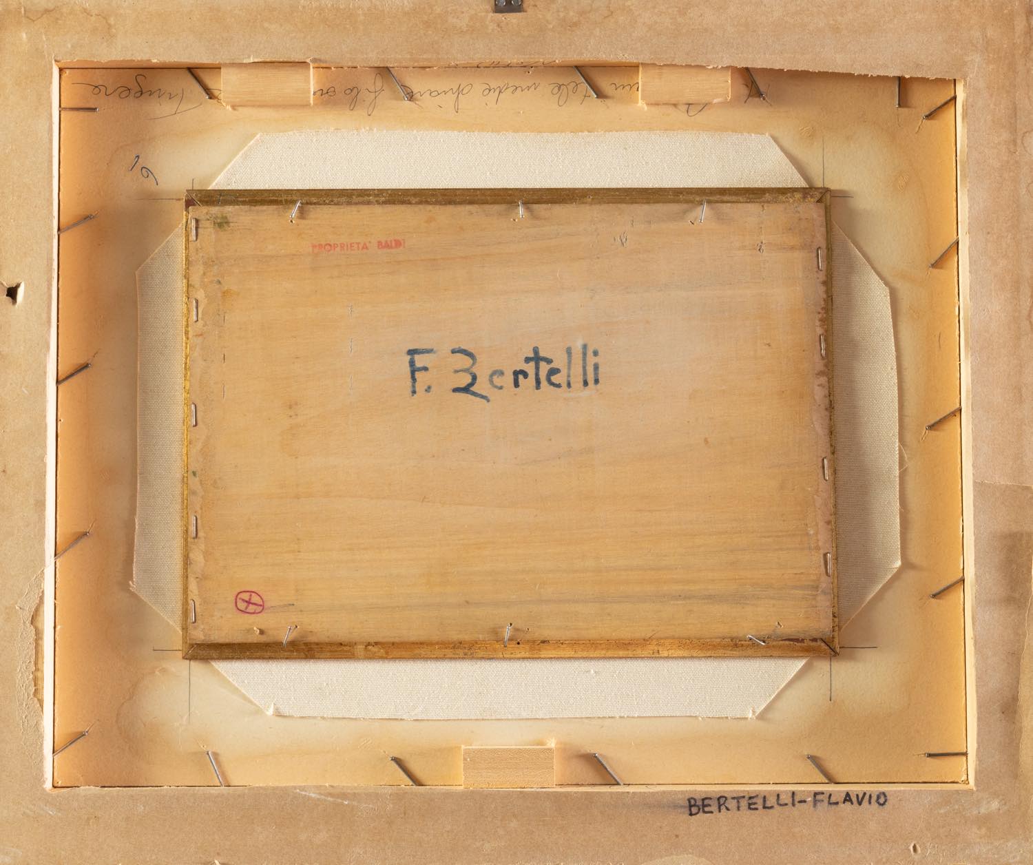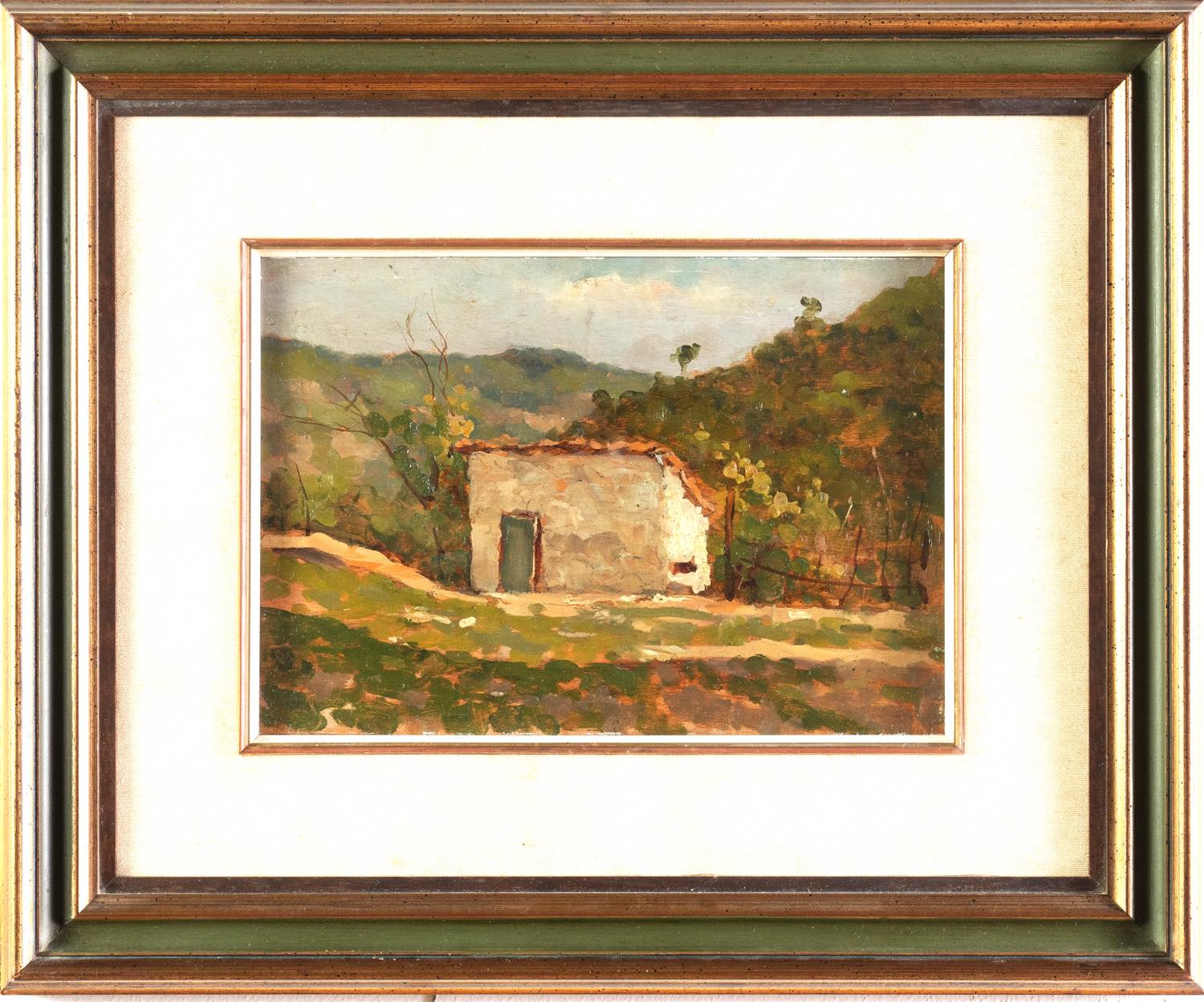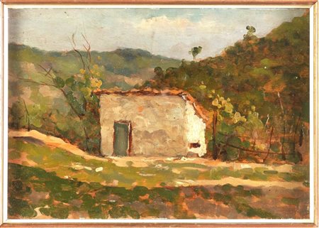 Flavio Bertelli (San Lazzaro di Savena 1865 – Rimini 1941), “Casolare”. - Olio su tavoletta, reca al retro firma e timbro “Proprietà Baldi” , H cm 22.5x33