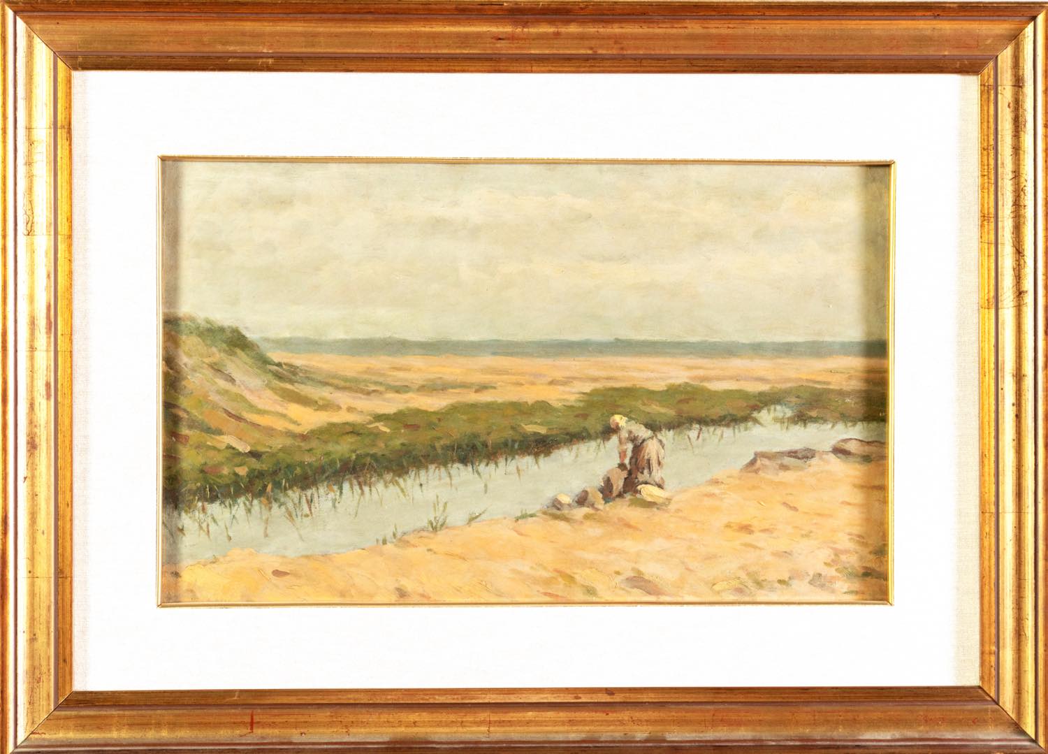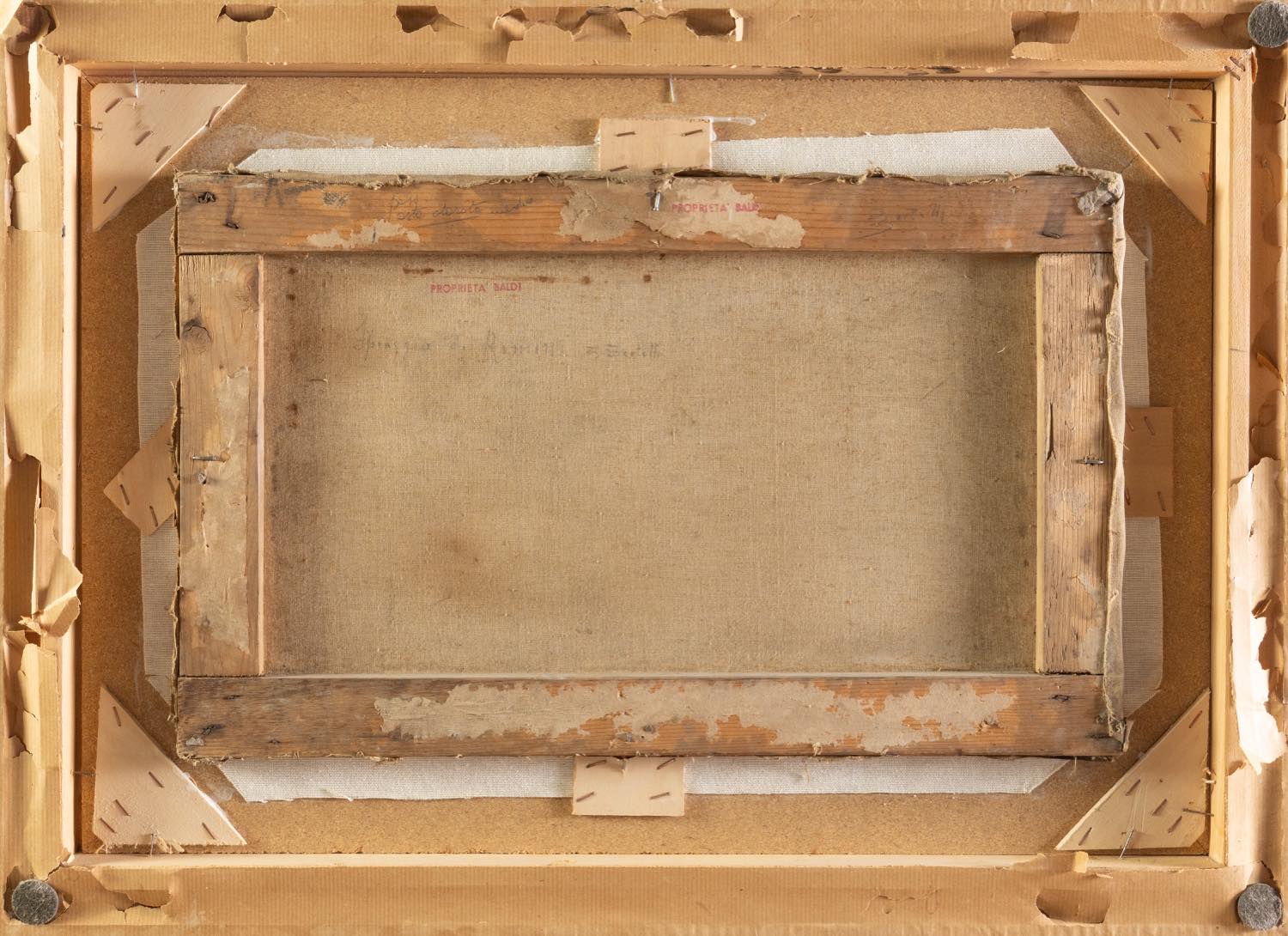 Flavio Bertelli (San Lazzaro di Savena 1865 – Rimini 1941), “Spiaggia di Rimini”. - Olio su tela, reca al retro titolo, firma e timbro “Proprietà Baldi” , H cm 31x50