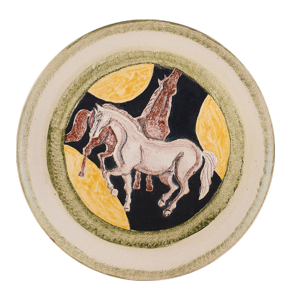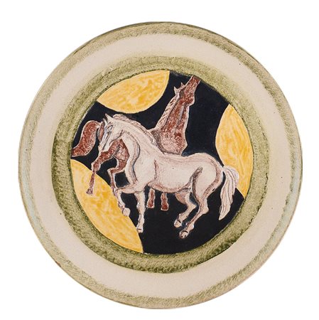 piatto in ceramica policroma diametro cm. 27, esemplare 6/9, firma al retro, opera registrata presso l'Archivio Lucio Ranucci come da dichiarazione su foto che cita: questo piatto è stato realizzato da Lucio Ranucci in collaborazione con la scultrice Brigitte Ruess sua compagna ed è stato firmato con le prime lettere di entrambe i nomi.