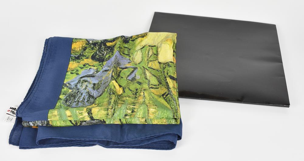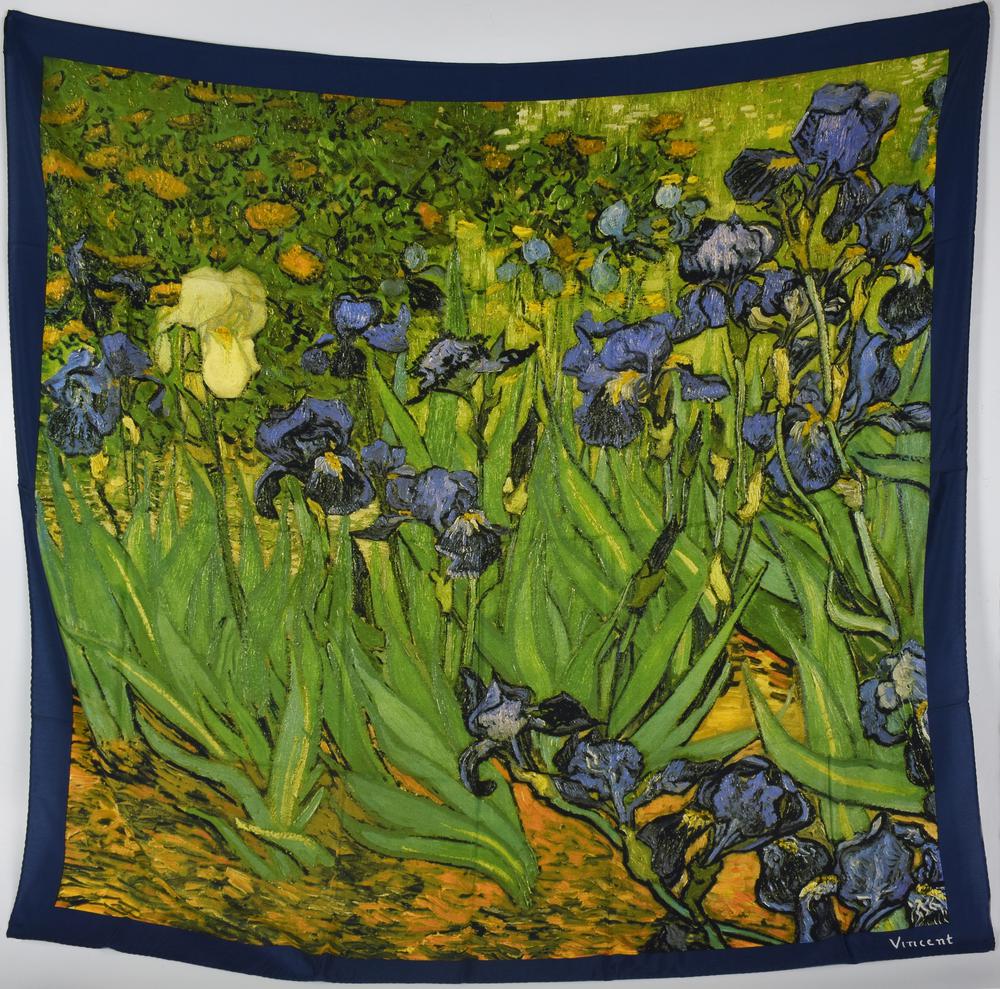 Silk scarf featuring a reproduction of Van Gogh's Iris. Dimensions: 96x96 cm. Presented with a box. Made in Italy. Perfectly preserved.