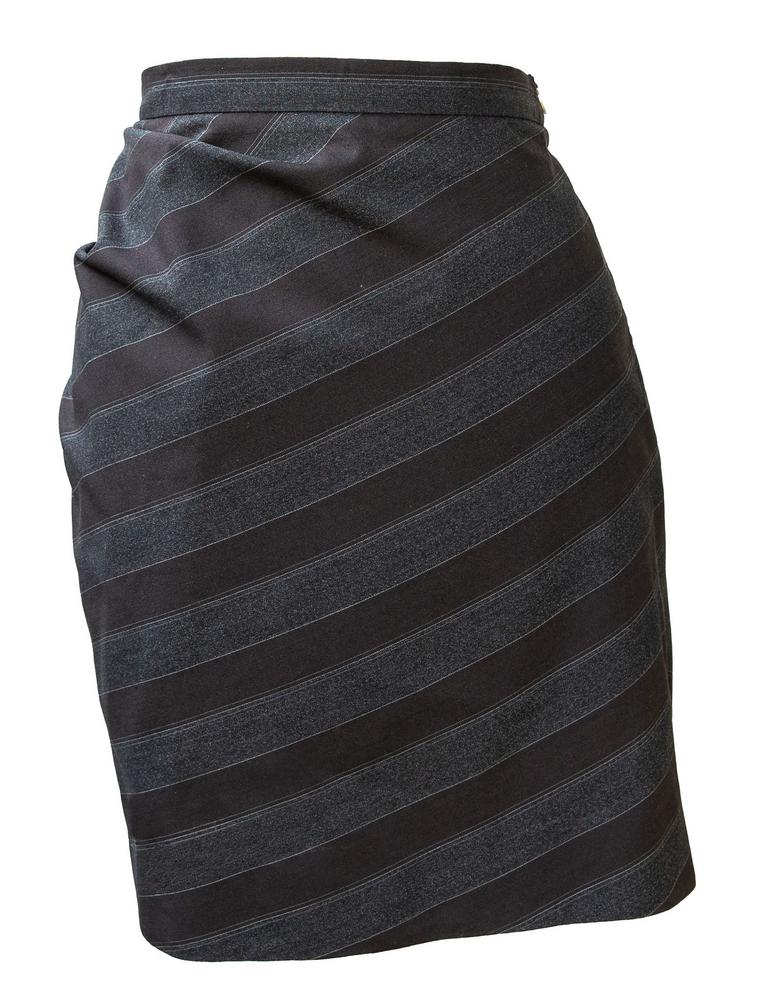 Lined pinstriped wool crepe skirt. Particular construction with 'panier' effect on the back. Made in Italy in the early 90s. Size IT 42. Perfectly preserved.