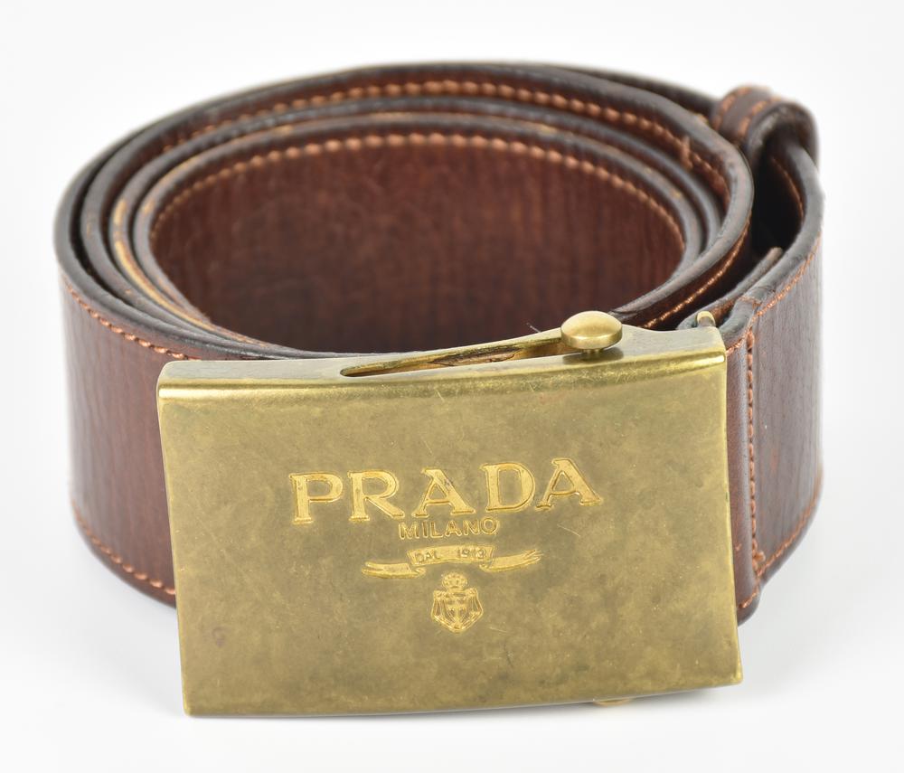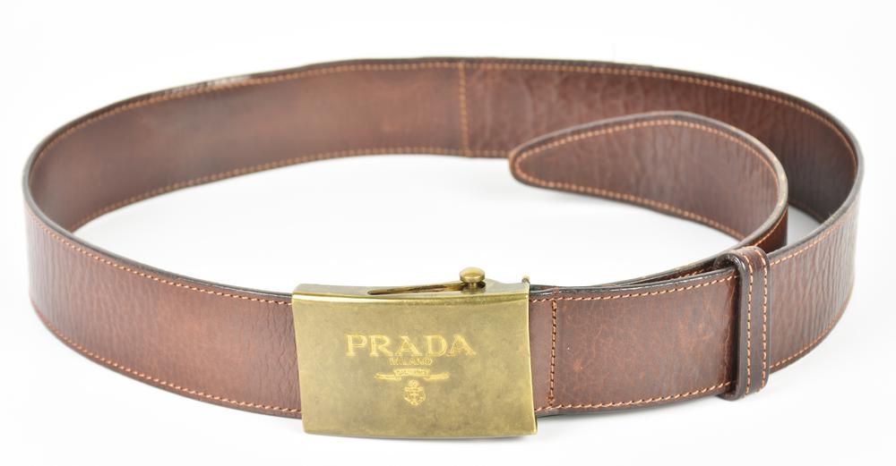 Prada LEATHER BELT DESCRIPTION: Leather belt with a sliding buckle engraved...
