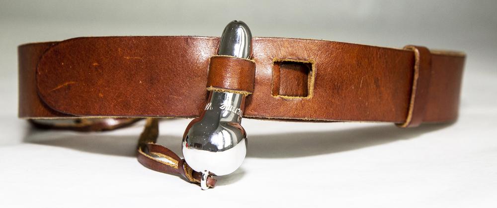 Rare natural cuir leather belt with silver-finish metal Penis clasp, detachable from the belt so it can also be used as a necklace separately. Production in the 90s. Circumference size adjustable to two lengths, the widest 70 cm. Well preserved.