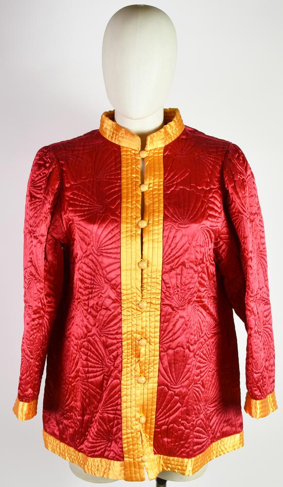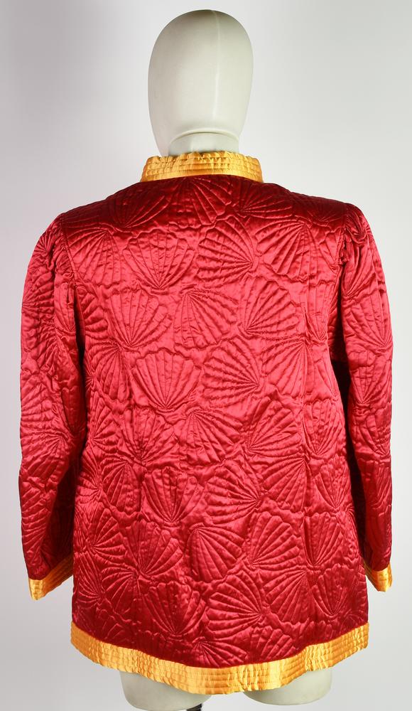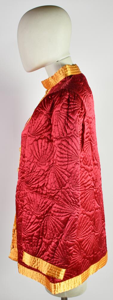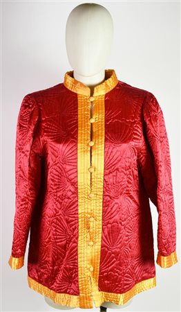 Giacca di foggia orientale in tessuto lucido rosso e giallo, con ricami a conchiglia. Taglia 36 FR. Anni ’80. Prodotto in Francia. Perfettamente conservato.