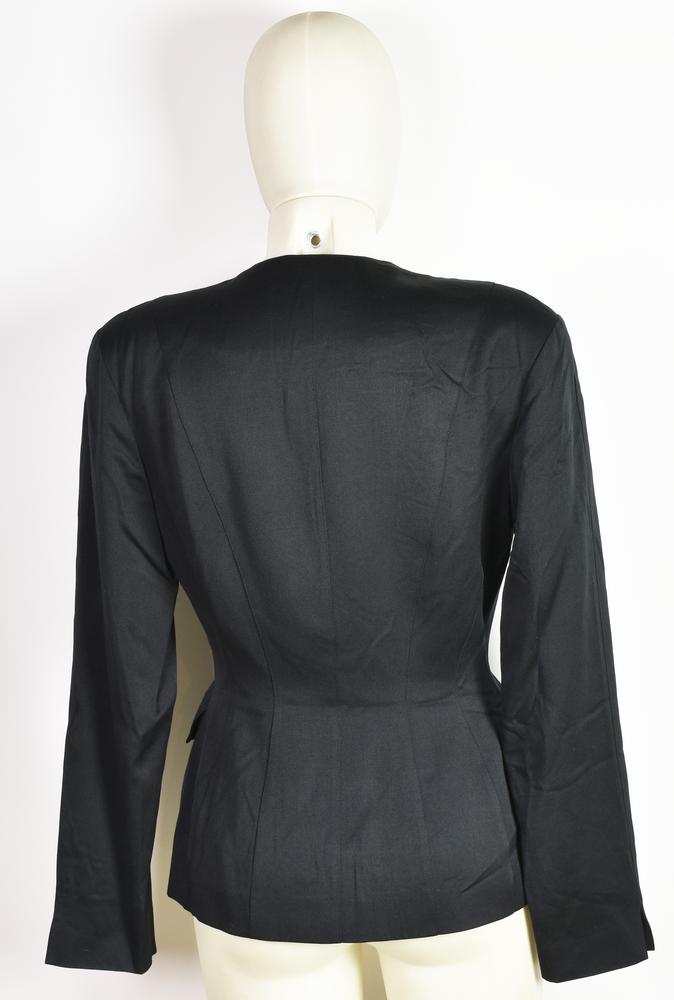 Giacca sciancrata a tre bottoni in misto lana. Presenta spalline imbottite e bottoni a pressione con logo della Maison. Manca etichetta di taglia, veste una 38-40 IT. Perfettamente conservata.