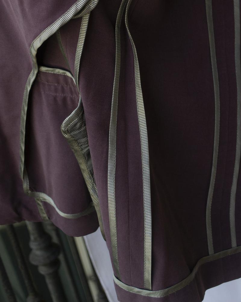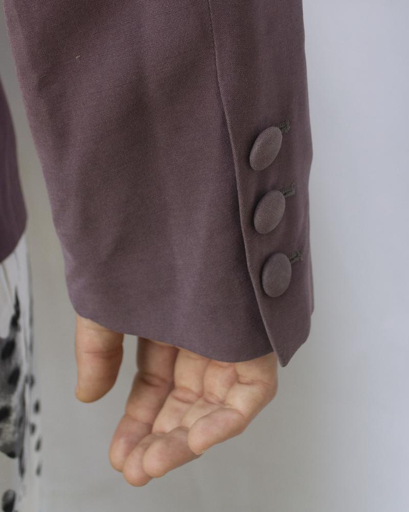 Colore malva per questa giacca in pura seta semi foderata con collo sciallato sfrangiato. Tasche con patta. Bottoni rivestiti in tessuto. Spalline. Primi anni '80, made in Italy. Taglia italiana 44. Perfettamente conservata.