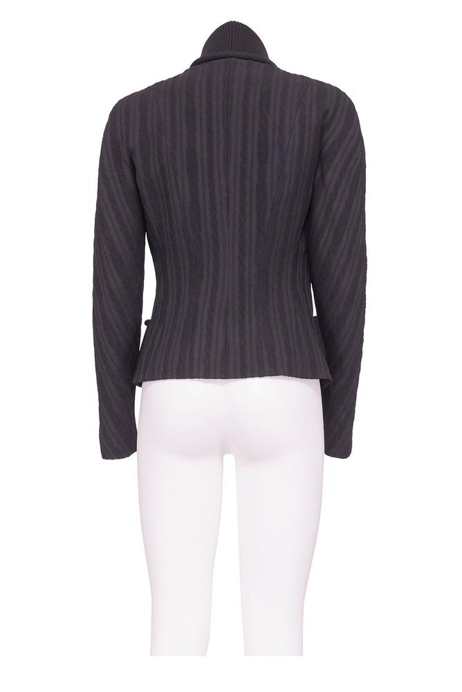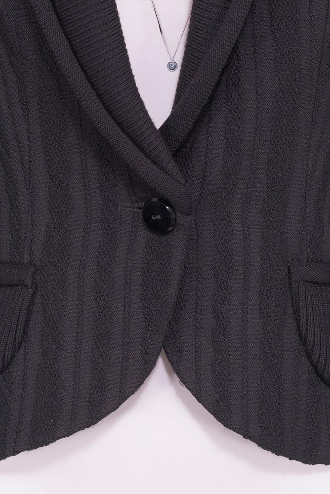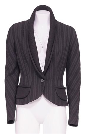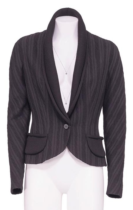 Iconica giacca con collo a scialle in maglia jacquard degli anni '90. Maniche intere senza cucitura. Completamente foderata. 98x100 lana, 1x100 nylon, 1x100 elastan. Fodera 100x100 seta. La taglia e' una FR 36. Eccellente.