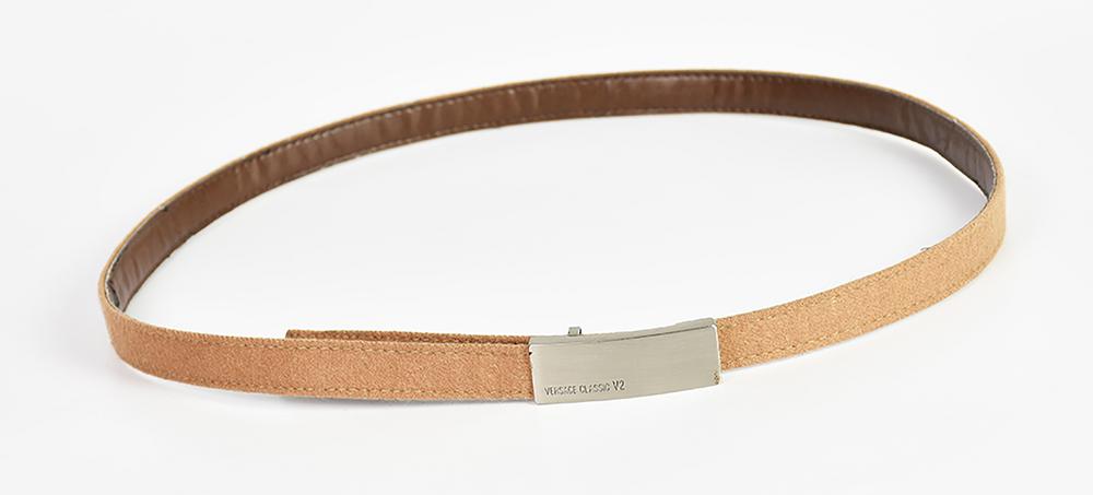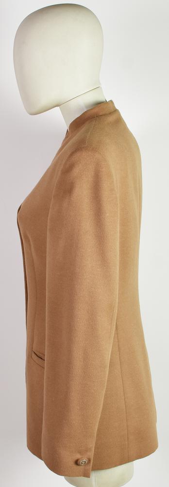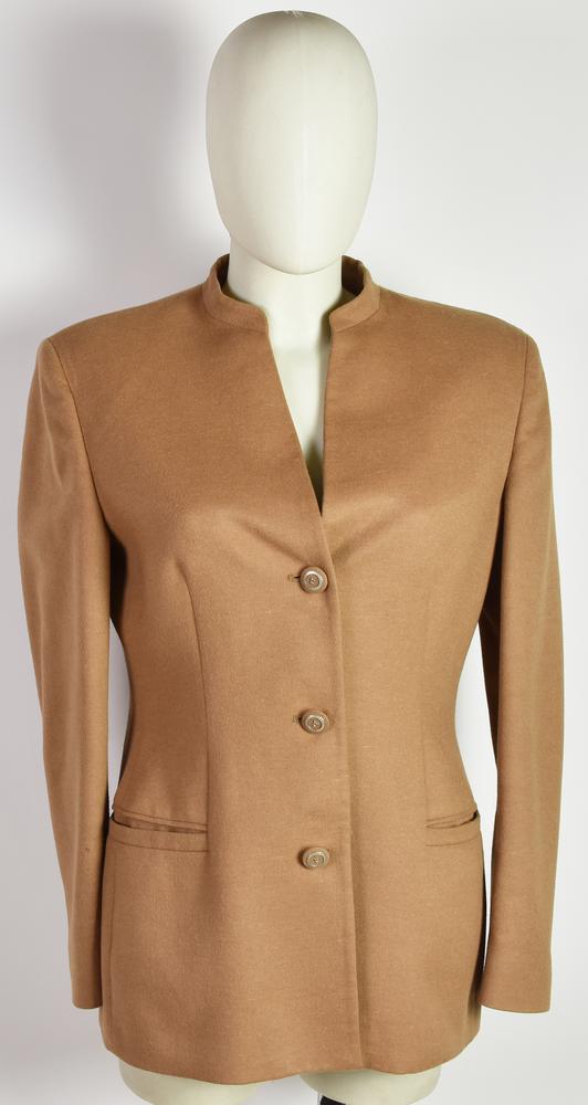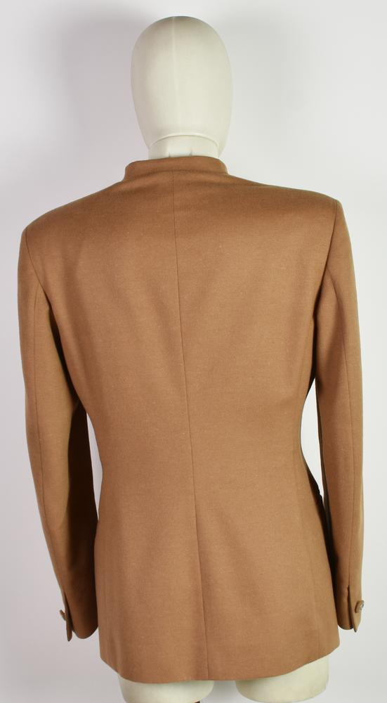 Giacca monopetto a tre bottoni in lana, angora e kashmir con collo alla coreana. Due tasche a filetto. Presenta cintura abbinata di cm 91,00 con fibbia in metallo logata. Taglia 44. Prodotto in Italia. Ben conservata.