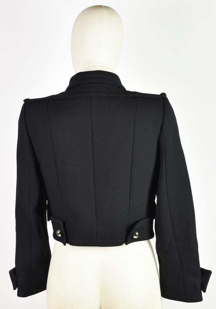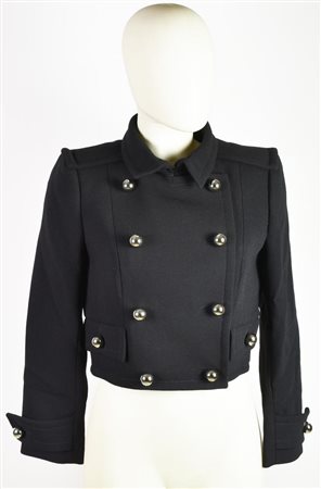 DESCRIPTION: Short black military-style jacket. Large spherical metal buttons. Early 2000s, designer Riccardo Tisci. 100% wool. Size 40. Made in France. Never worn, still with tag. Excellent conditions.
