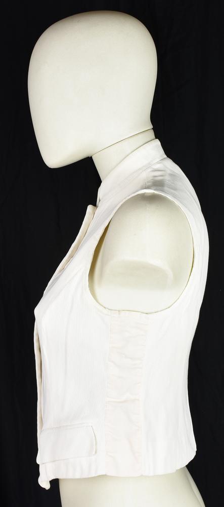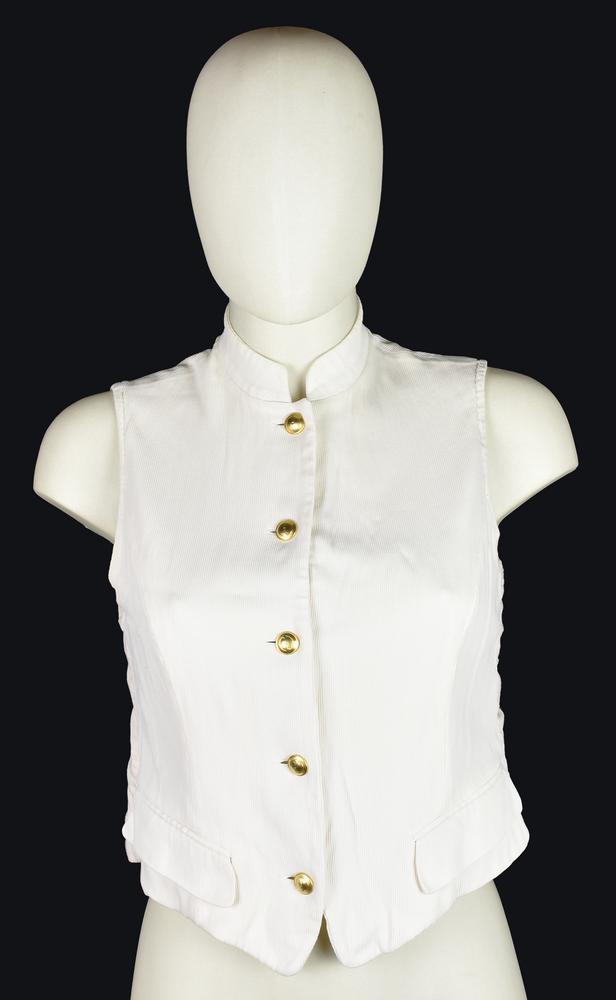 White sleeveless top in the style of a waistcoat. Features gold buttons with the brand's logo. Composition label is missing. Size 42 IT. Made in Italy. A slight stain on the collar does not compromise its overall excellent condition. Well preserved.