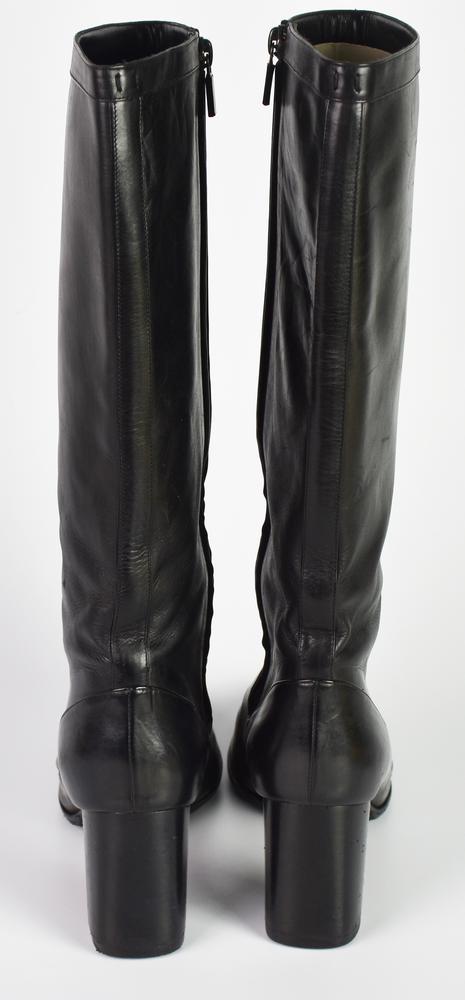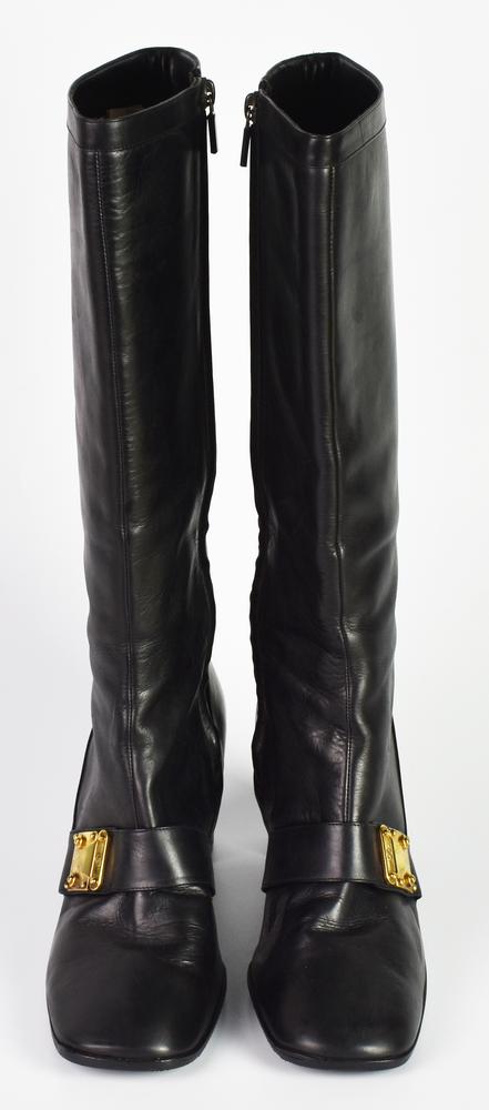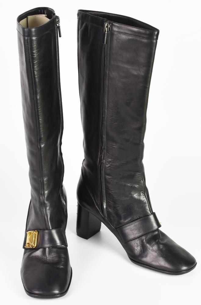 Black leather boots with a decorative strap on the instep and gold metal studs with the Maison’s logo. Internal side zipper. Heel height: 7,50 cm. Size 39. Made in Italy. Well preserved.