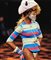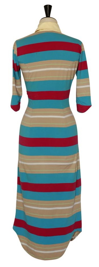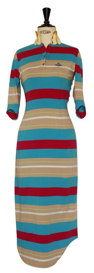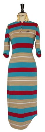 Abito lungo in jersey di cotone stretch a righe multicolore e colletto polo alto in piquet di cotone, logo orb ricamato sul petto. Dalla collezione Cafe' Society primavera estate 1994. Taglia M. Made in Italy. Perfettamente conservato.