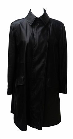 Cappotto in pelle al ginocchio in nero, fodera trapuntata rossa, chiusura con zip centrale davanti sovrapposta, fondo manica con zip. Spalla con spalline, forma leggermente svasata. Tasche con patta. Primi anni '80. Taglia 42. Made in Italy. Perfettamente conservato.