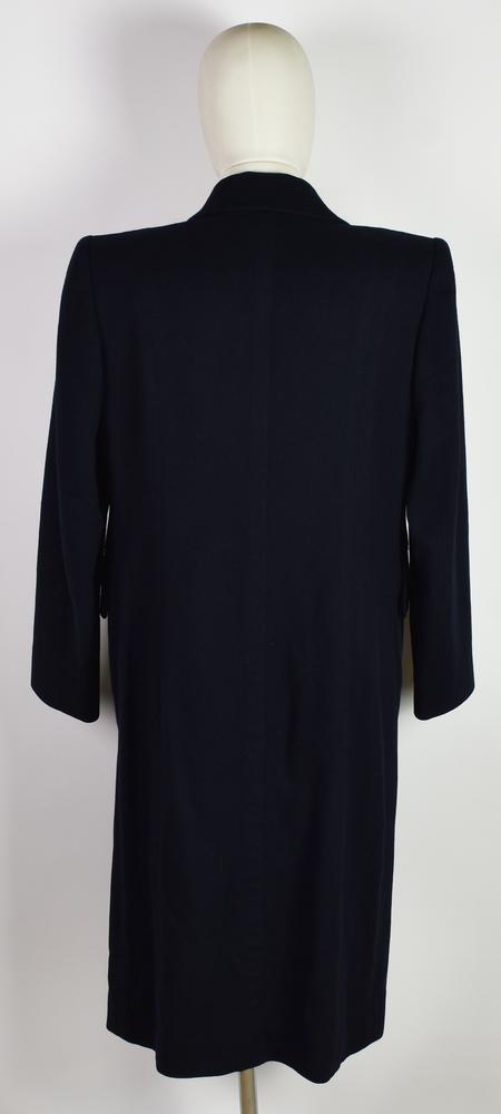 Single-button dark blue cashmere coat. Features two front pockets and padded shoulders. 100% cashmere. Size 40 FR. Made in France. Perfectly preserved.