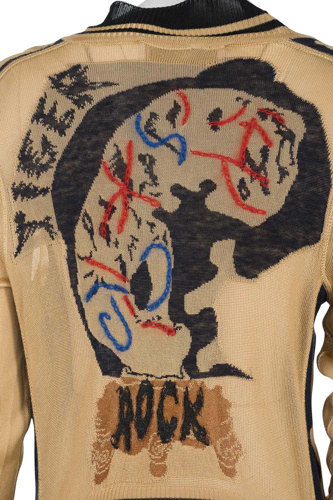 Iconico e raro cardigan in viscosa jacquard della collezione Primavera Estate 2005 'Ultra Femininity'. Effetto redingote trompe l'oeil del XVIII secolo. Piu' corto sul retro. A coste sul fondo e motivo decorativo jacquard sulla schiena. Senza etichetta di composizione, sembra essere in viscosa. La taglia e' una S. Discretamente Conservato, diverse macchie sul fondo, Diversi fili tirati.