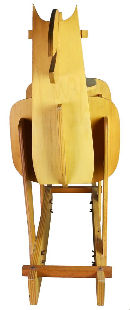 CAVALLO A DONDOLO, 1960 ca fogli di legno di compensato con impiallacciatura...