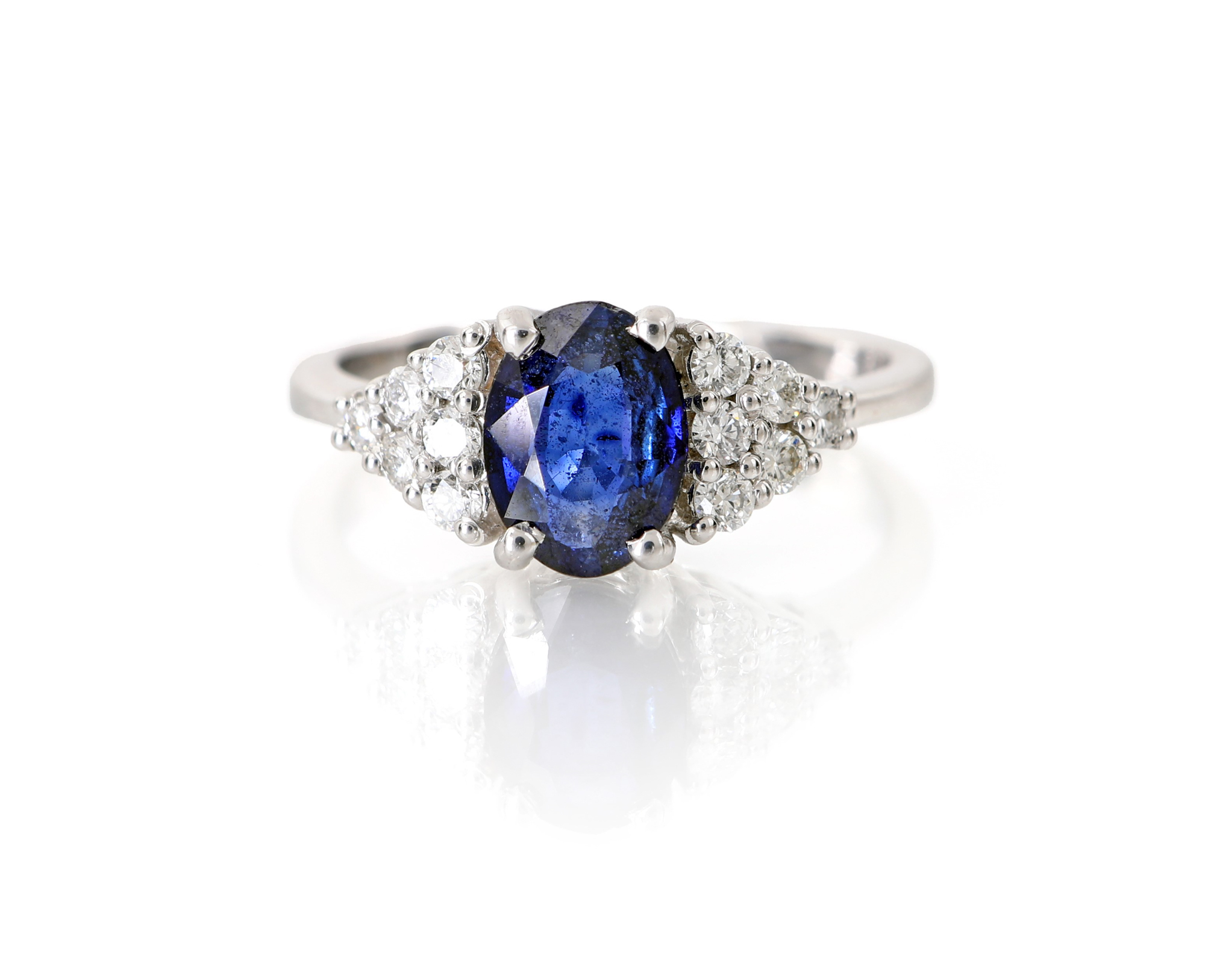 Anello in oro, zaffiro e brillanti Oro bianco 750/000. Diamanti in taglio rotondo brillante ct. 0,40 ca. , zaffiro in taglio ovale ct. 1,50 ca. Peso complessivo gr. 3,80 Misura 13