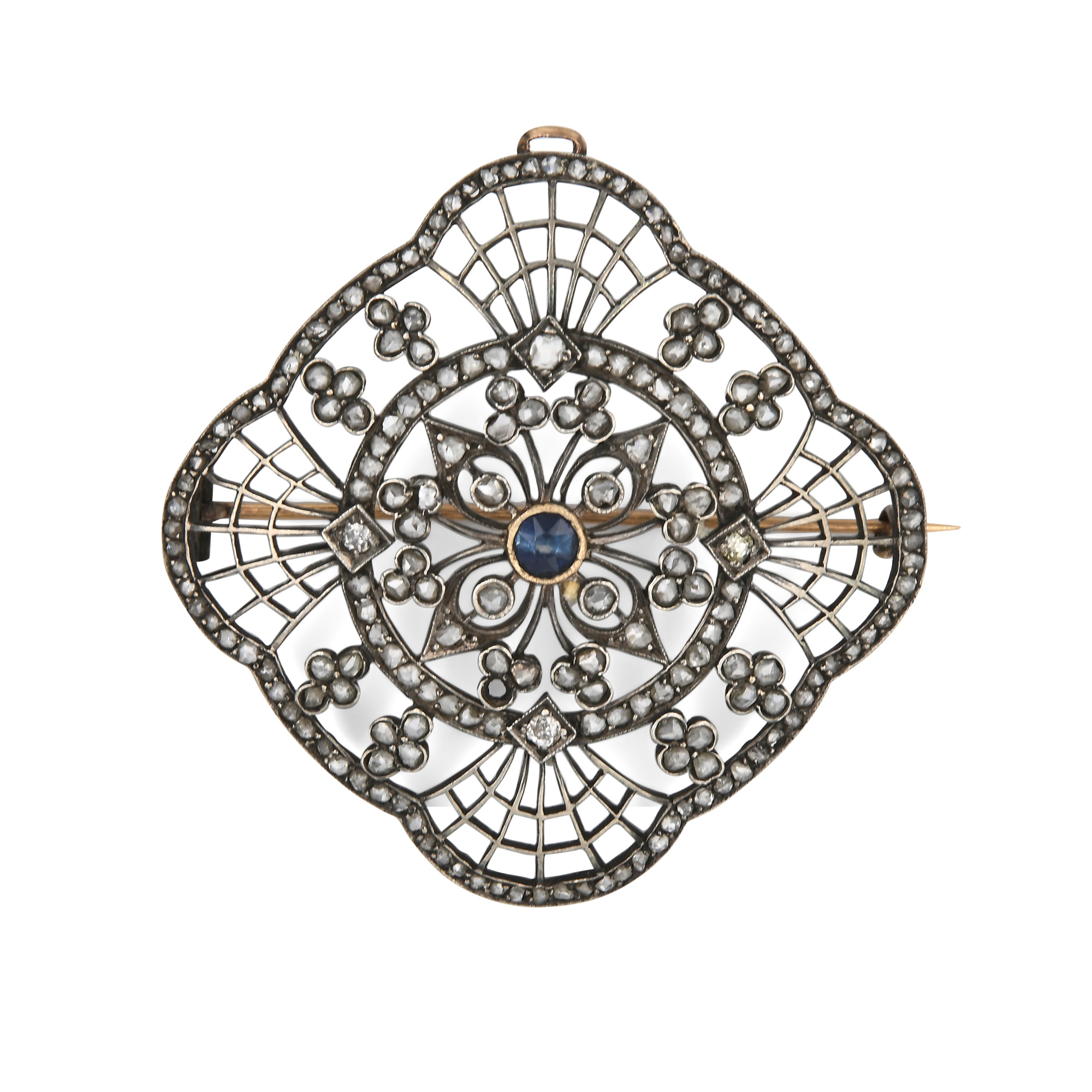 Lot 71 | Spilla antica in oro, diamanti e pietra blu Oro a basso titolo e argento....