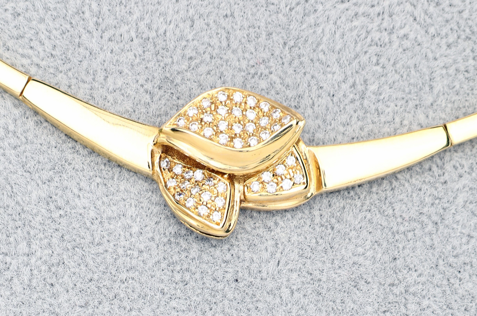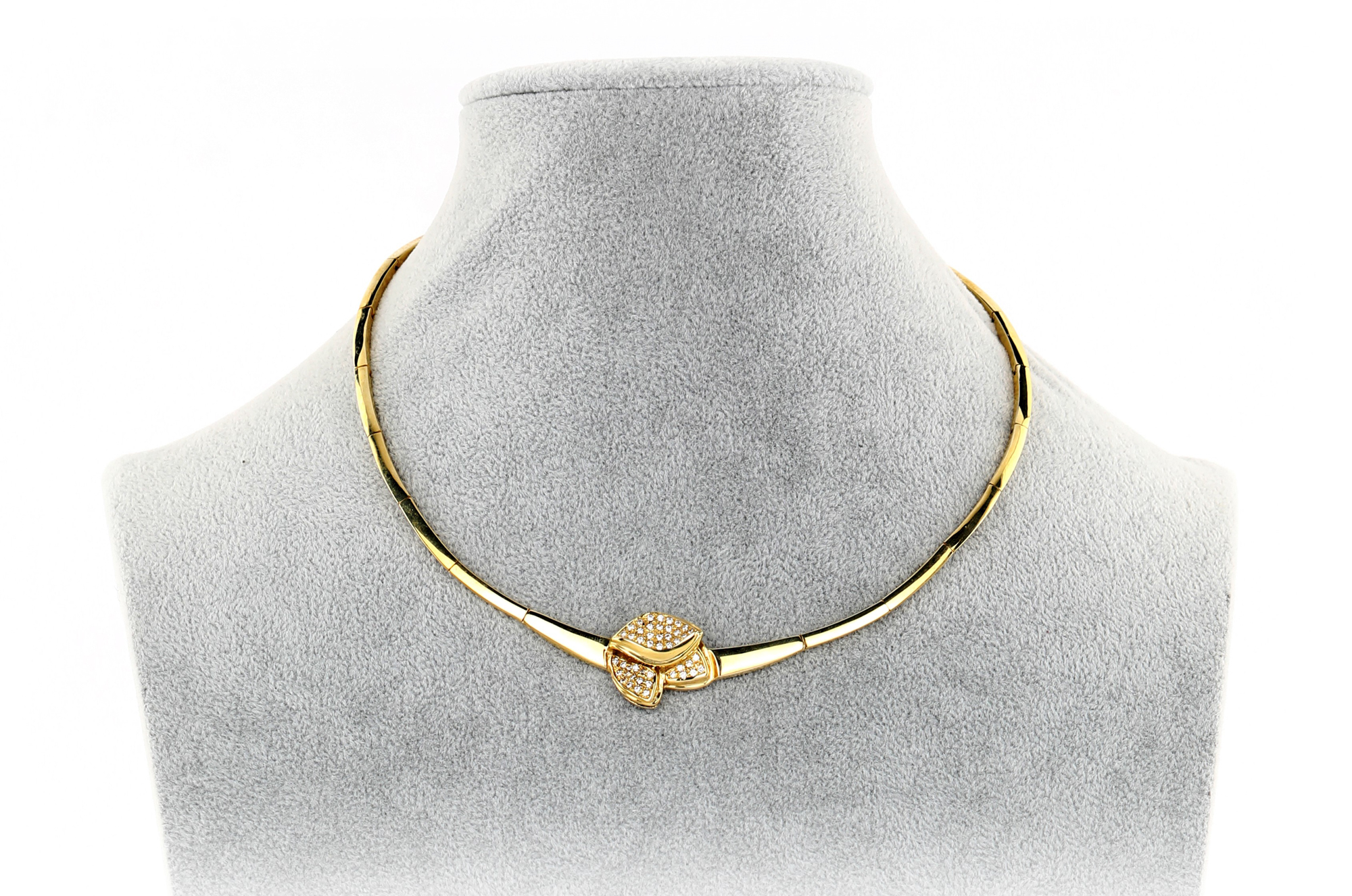 Girocollo in oro e brillanti Oro giallo 750/000. Diamanti in taglio rotondo brillante ct. 1 ca. Peso complessivo gr. 32,60. Veste cm 42