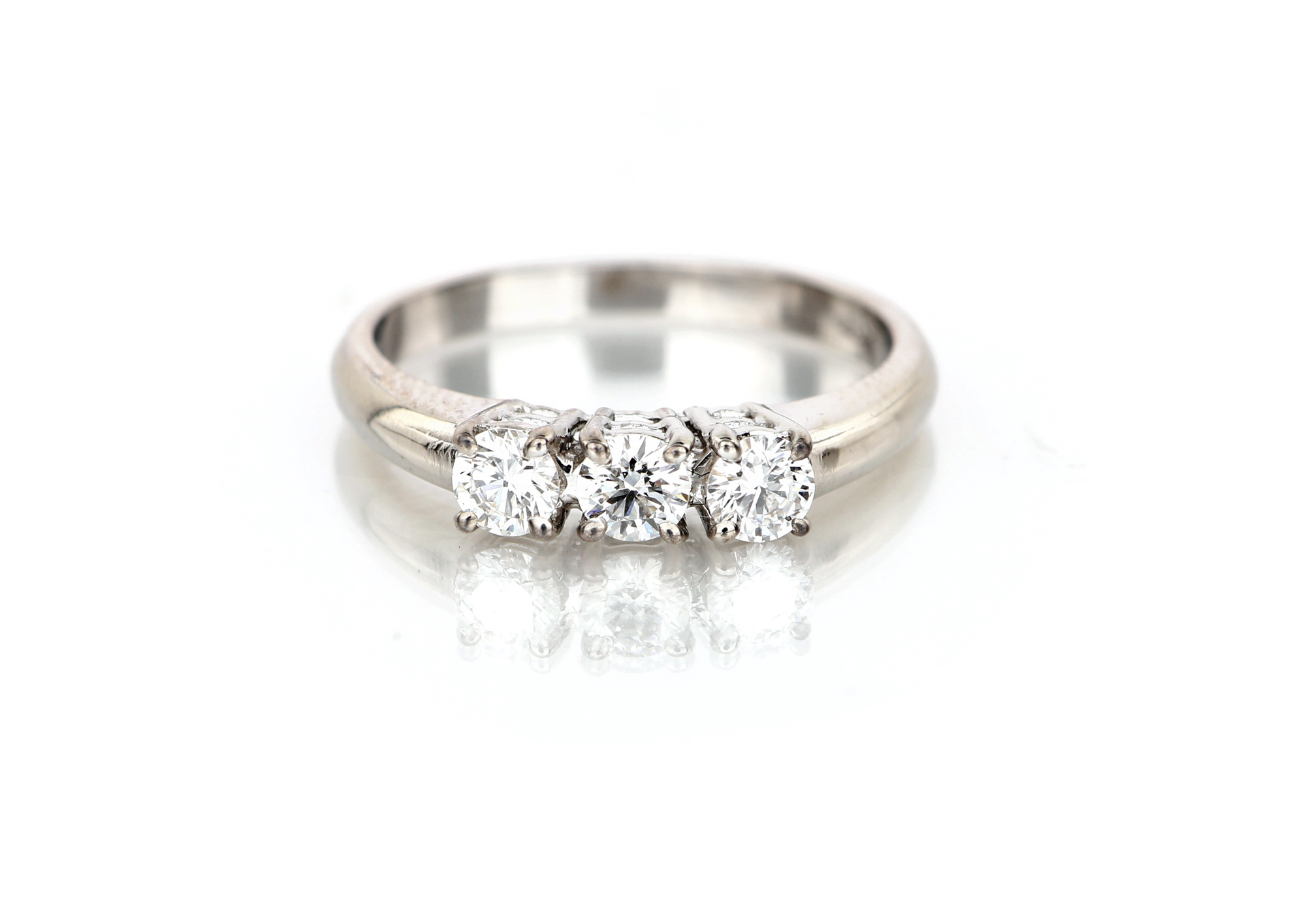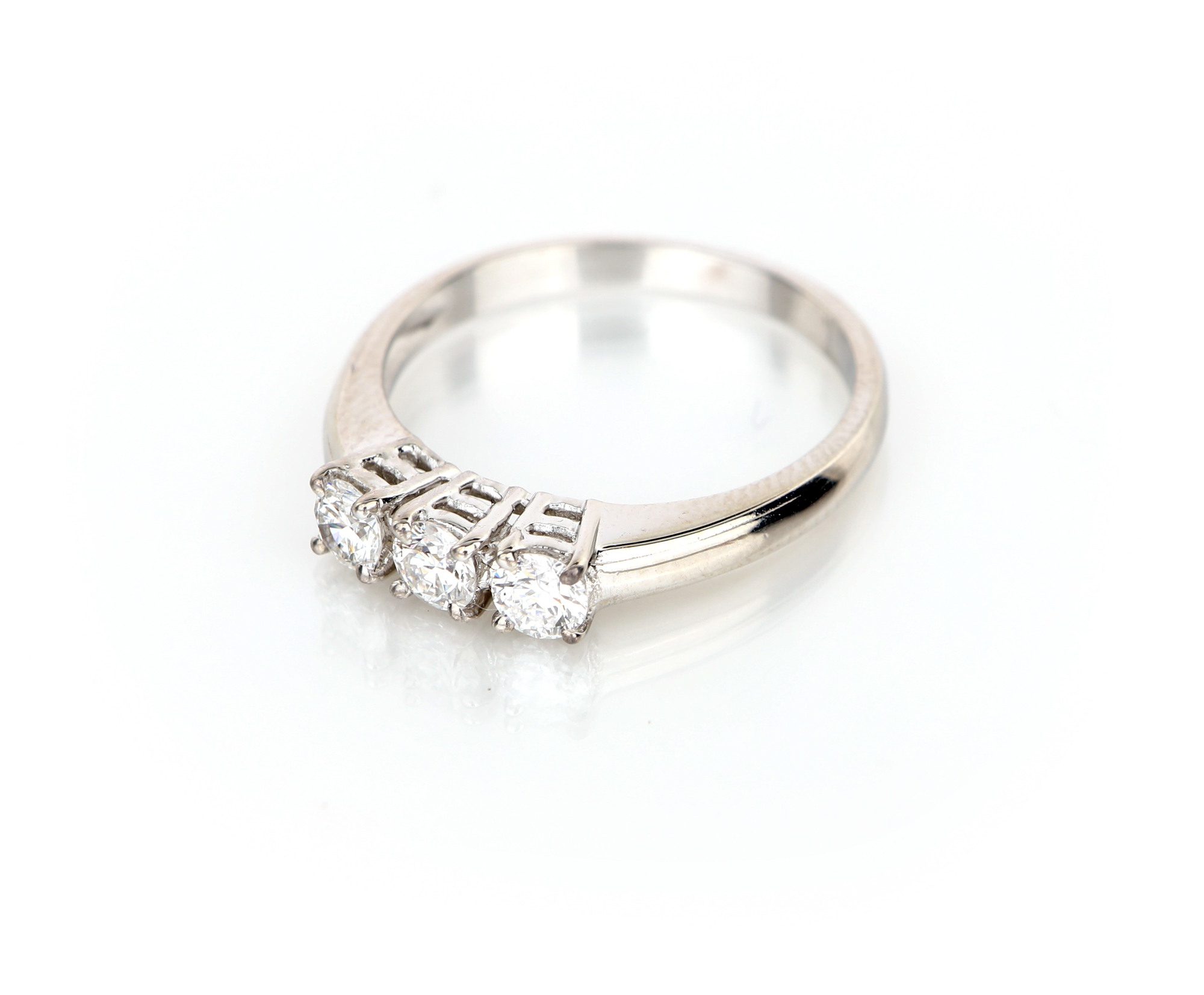 Anello trilogy in oro e brillanti Oro bianco 750/000. Diamanti in taglio rotondo brillanti ct. 0,50 ca. prob. F - VVS1. Peso complessivo gr. 3. Misura 14