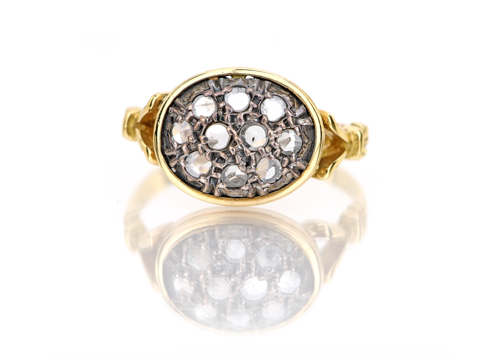 Anello a toppa in oro, argento e diamanti Oro 750/000. Peso complessivo gr 5 Misura 17