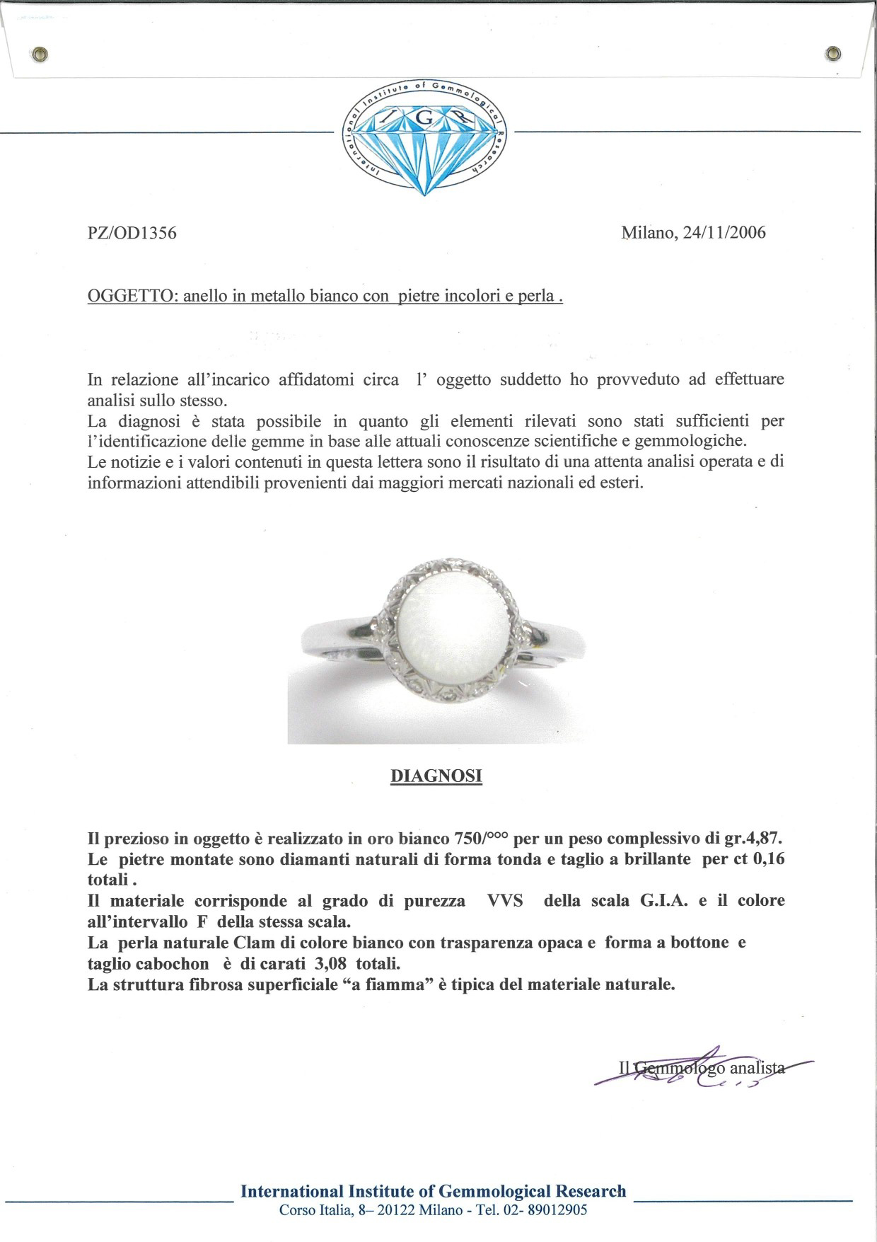 Anello in oro, perla Clam e brillanti Oro bianco 750/000. Perla naturale spontanea Clam ct. 3,08. Diamanti in taglio rotondo brillante F, VVS 1.Peso complessivo gr 4,90.Corredato di certificazione gemmologica IGR 1356 Misura 12