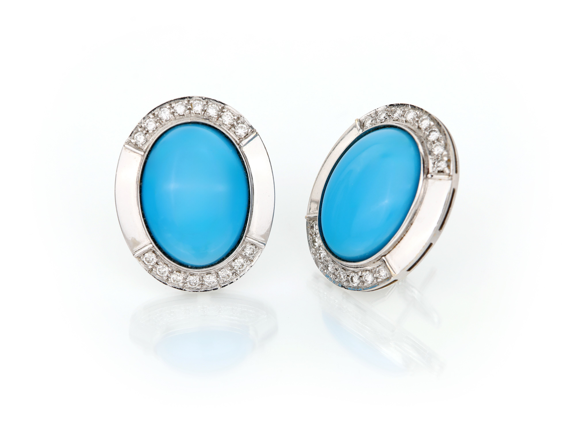Coppia di orecchini in oro, turchese e brillanti Oro bianco 750/000. Peso complessivo gr. 21. cm 2,5 x 2