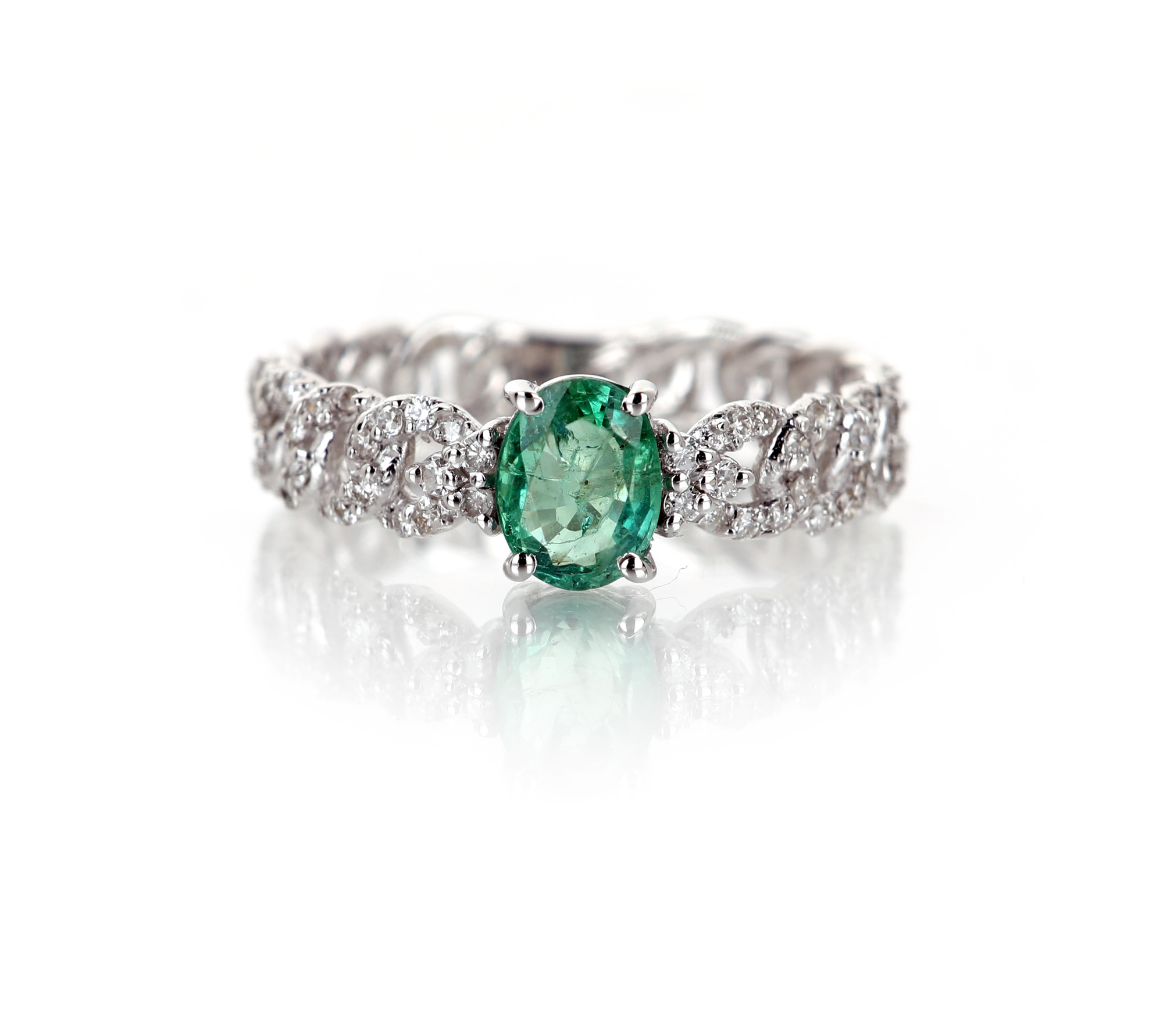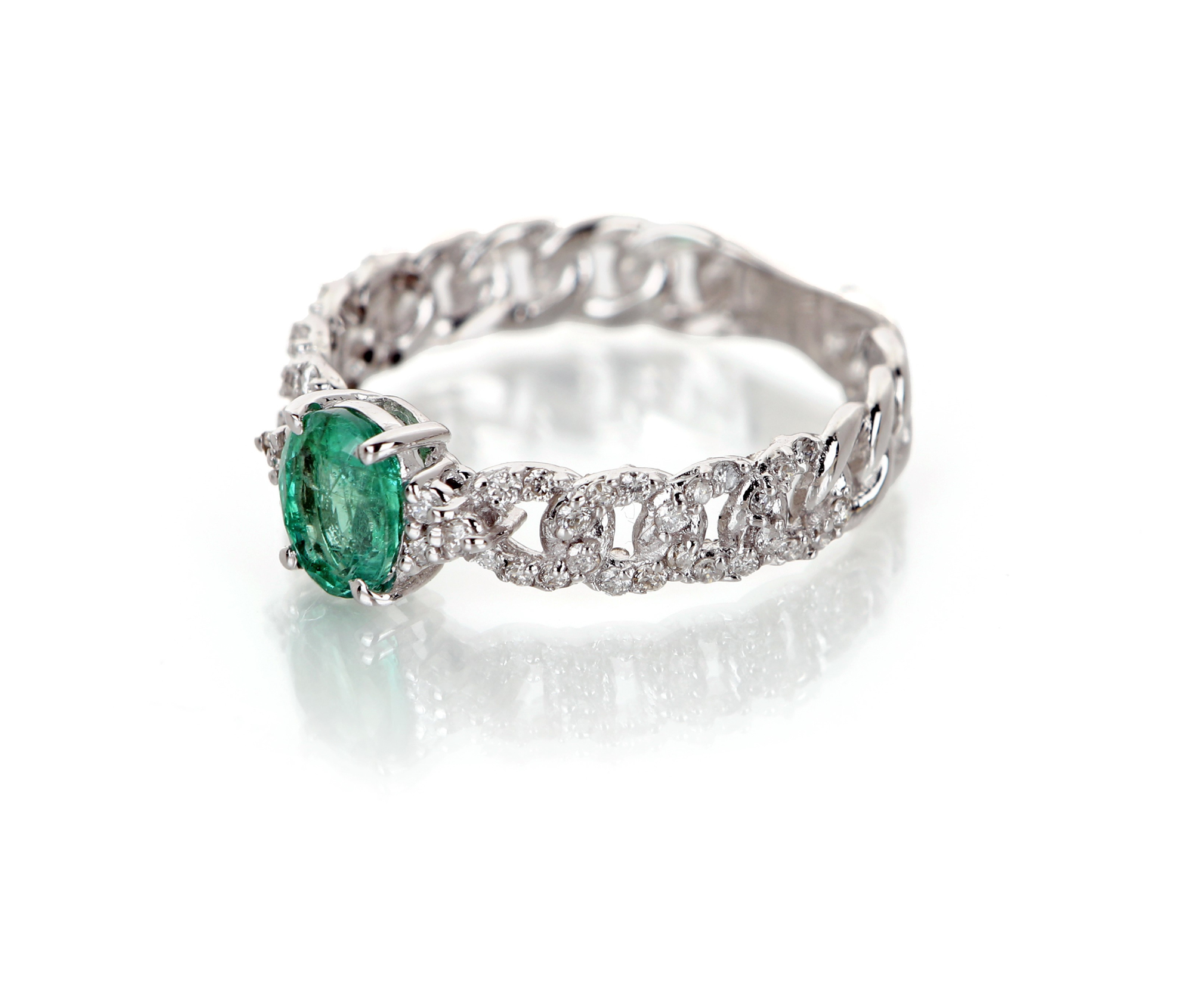 Anello in oro, smeraldo e brillanti Oro bianco 750/000. Diamanti in taglio rotondo brillante ct. 0,40 ca. , smeraldo in taglio ovale ct. 1 ca. Peso complessivo gr. 3 Misura 13