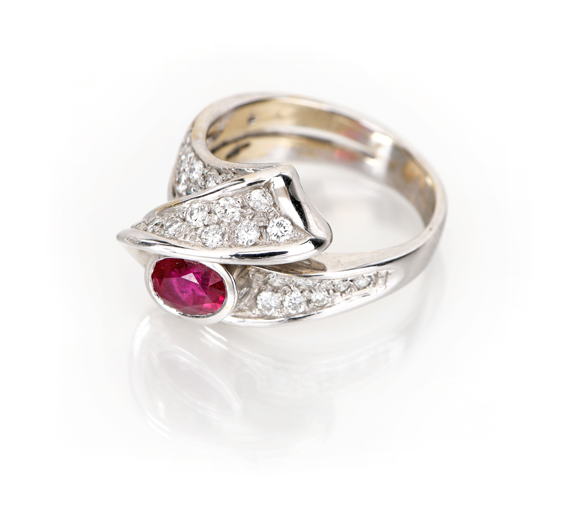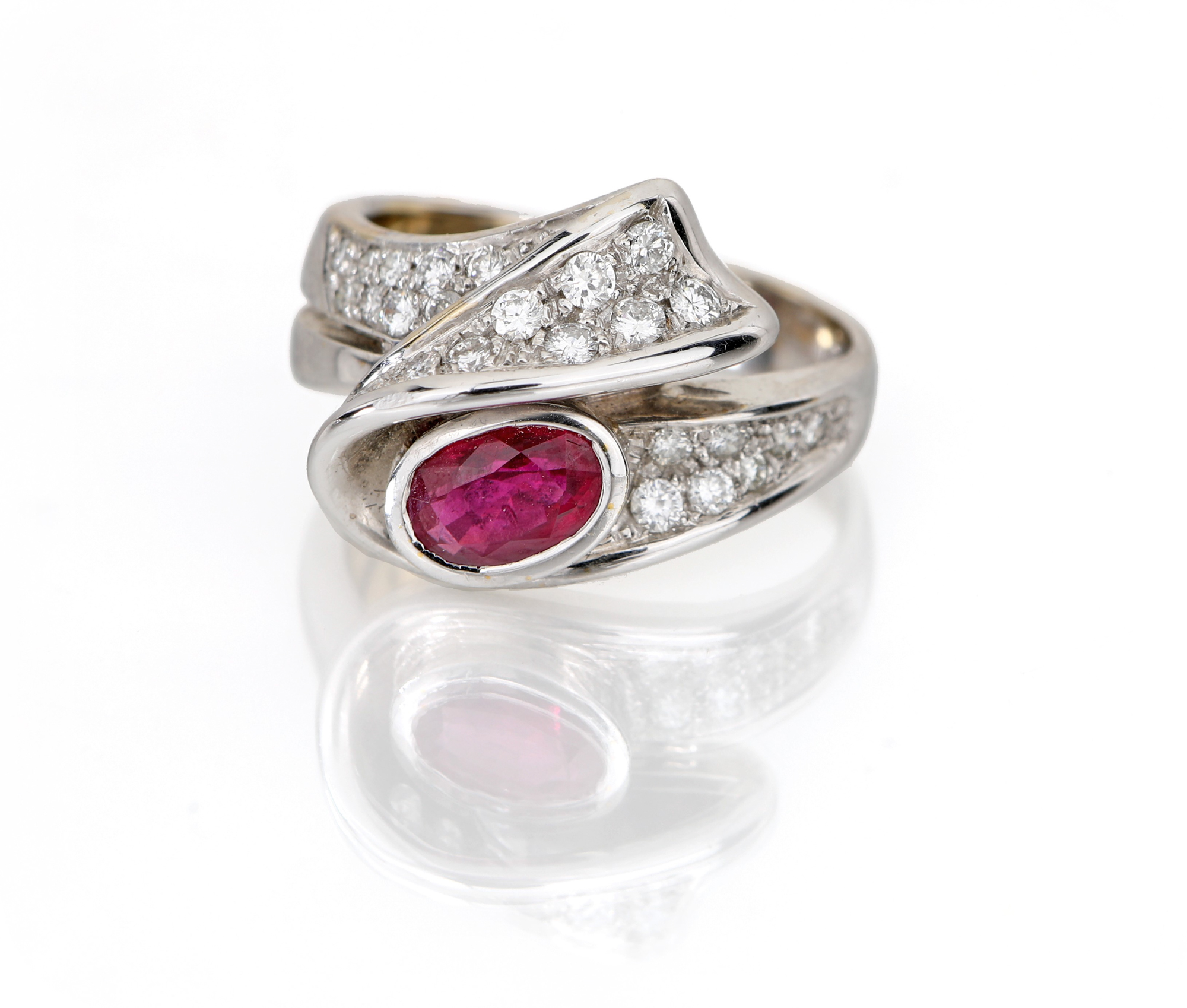 Anello in oro, brillanti e rubino Oro bianco 750/000. Rubino in taglio ovale ct 1,30, diamanti in taglio rotondo brillante ct. 0,50. Peso complessivo gr. 9,20 Misura 13