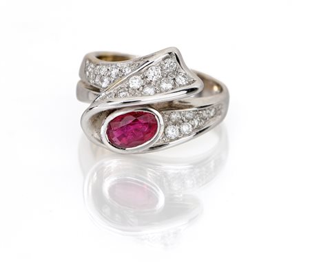 Anello in oro, brillanti e rubino Oro bianco 750/000. Rubino in taglio ovale...