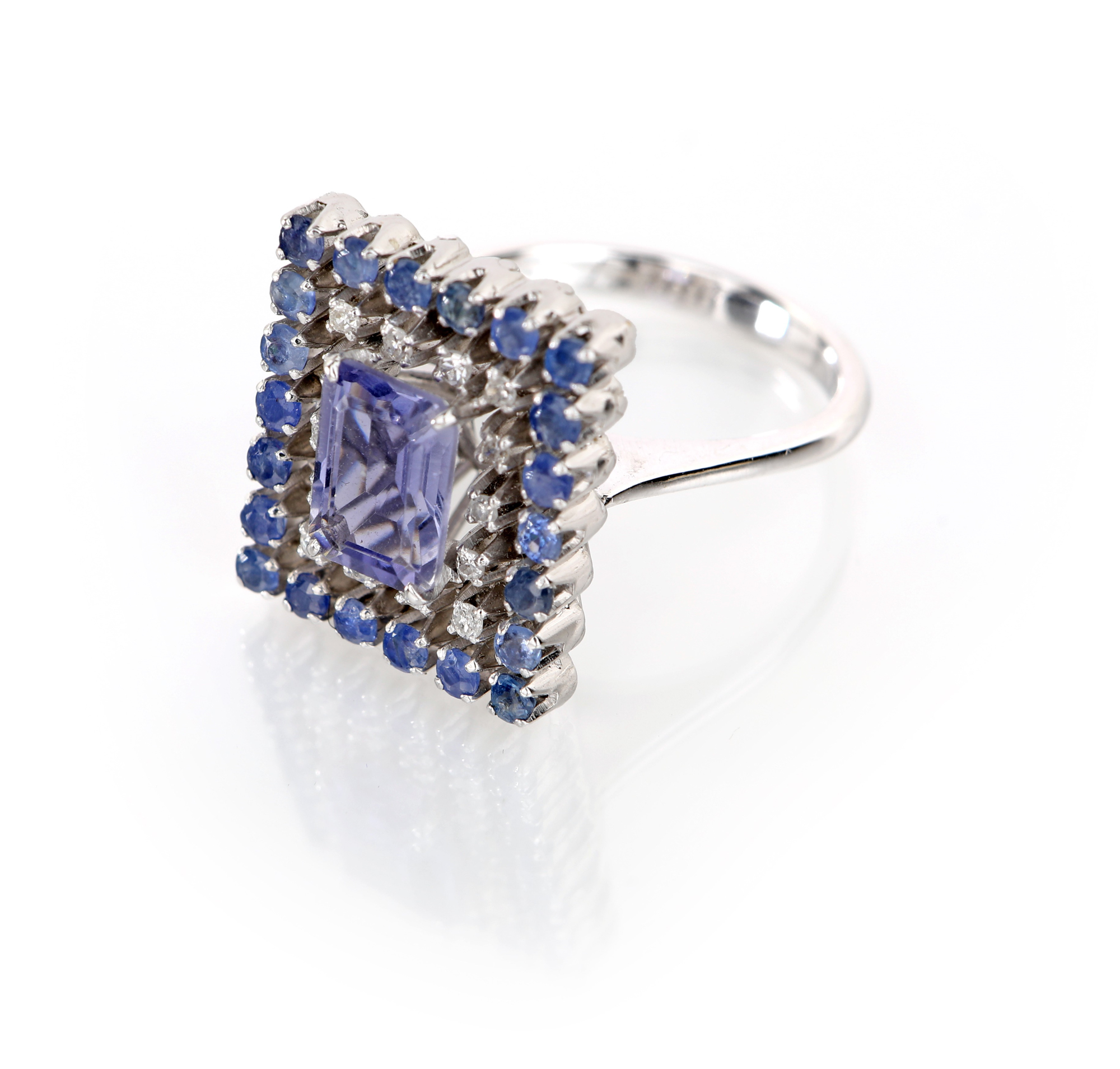 Anello in oro tormalina, zaffiri e brillanti Oro bianco 750/000. Peso complessivo gr 8,5 Misura 15