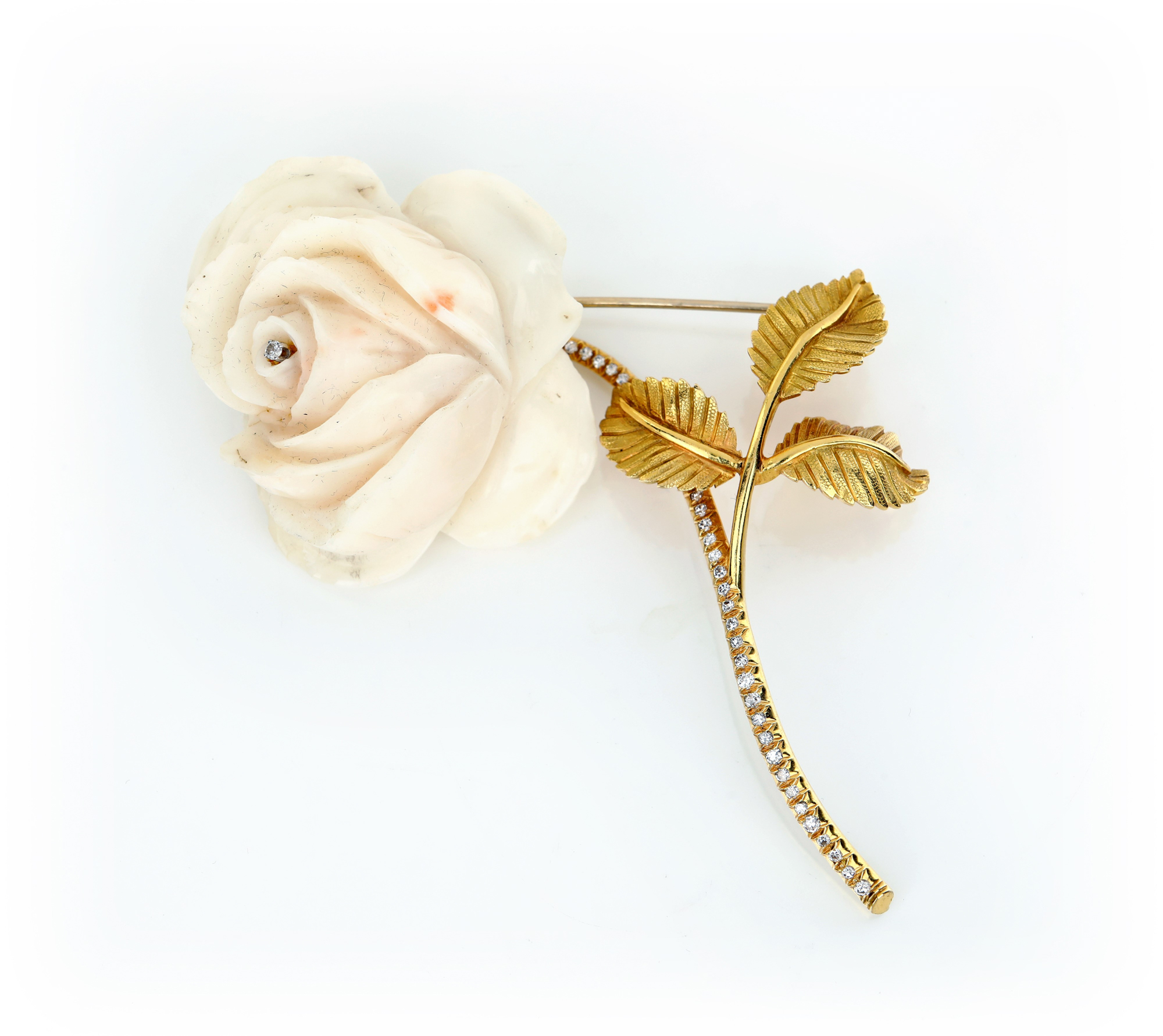 Grande spilla in oro brillanti e rosa in corallo Oro giallo 750/000. Peso complessivo gr. 54,10 cm 10