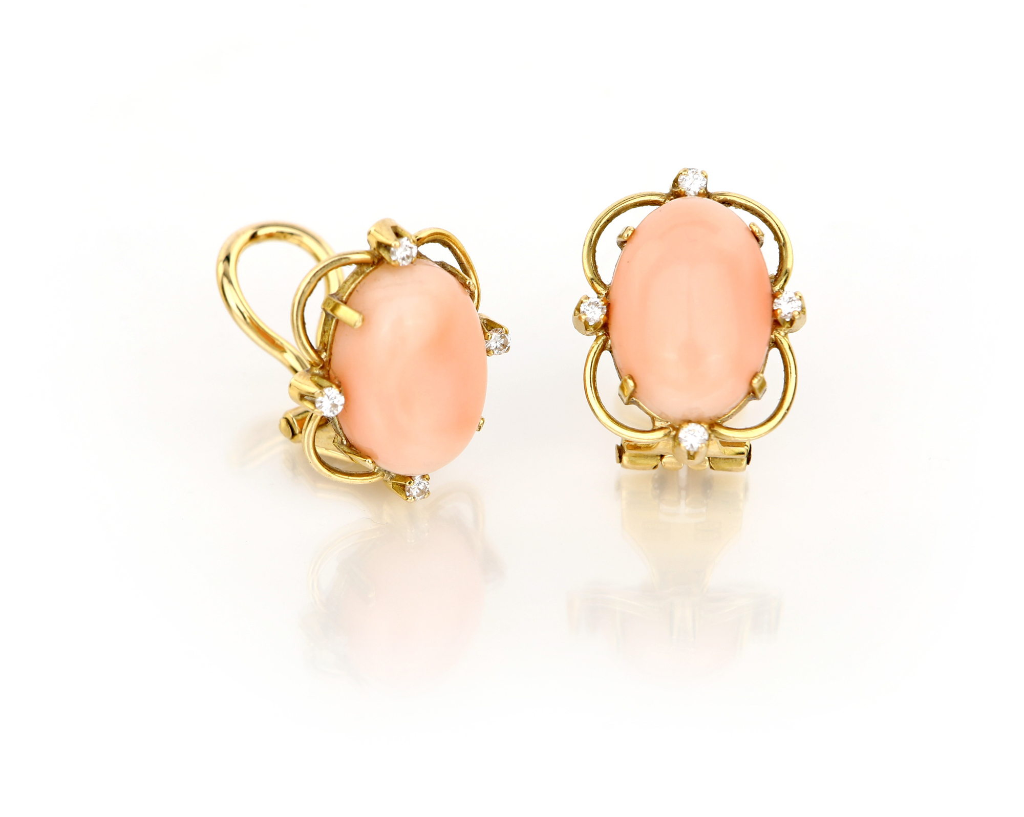 Coppia di orecchini in oro, corallo e brillanti Oro giallo 750/000. Peso complessivo gr. 8,50 cm 2 x 1