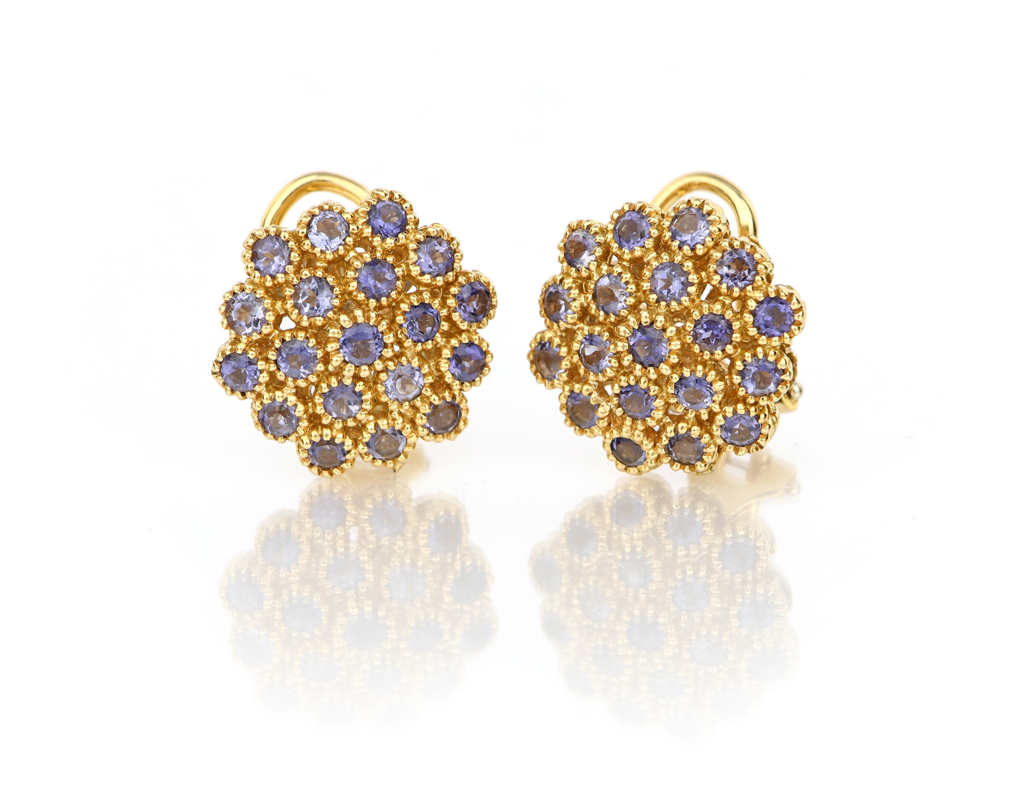 Coppia di orecchini in oro e tanzaniti Oro giallo 750/000. Peso complessivo gr. 12,10 Diametro cm 1,5