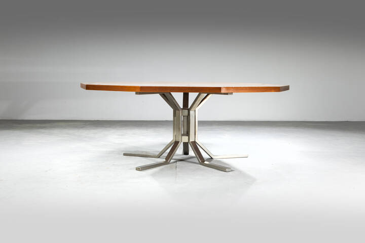 Grande tavolo con struttura in metallo satinato e piano impiallacciato in legno.
