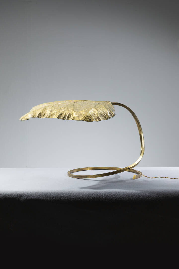 Struttura in ottone con tre grandi foglie, ciascuna con una singola luce.