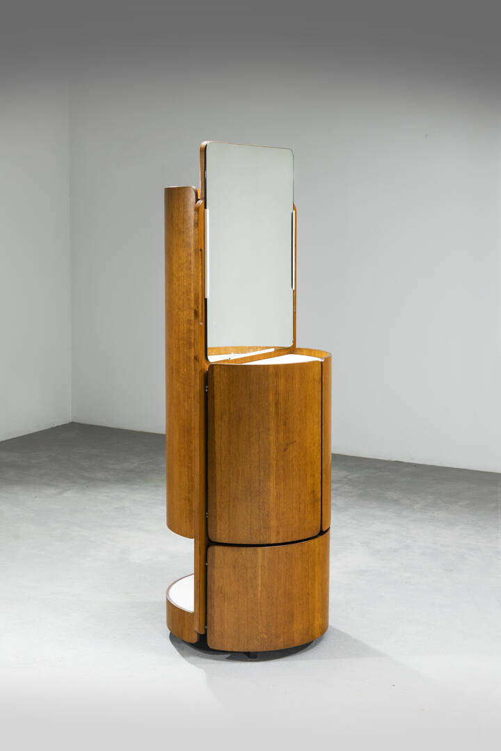 Mobile girevole da centro a forma cilindrica con appendiabiti interno, portaoggetti e specchio.