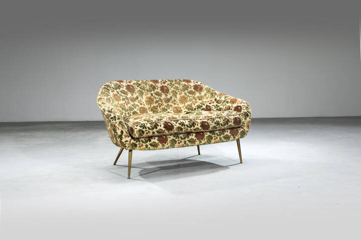 Divano con imbottitura rivestita in tessuto a fiori, piedi in ottone.