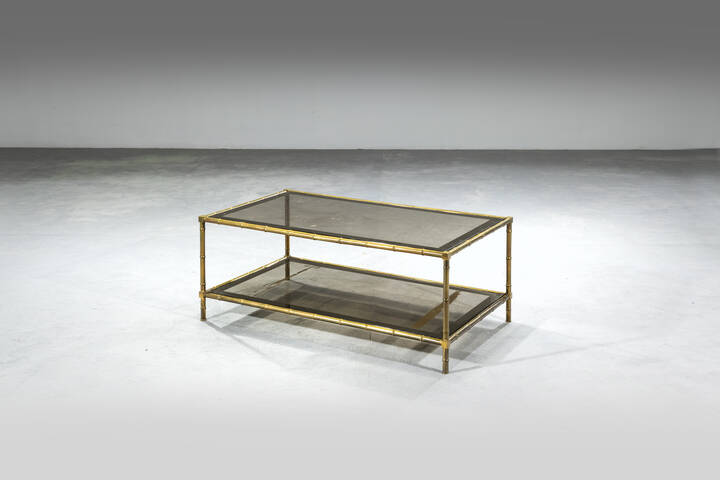 Struttura in ottone, piani in vetro fumè e specchiato.