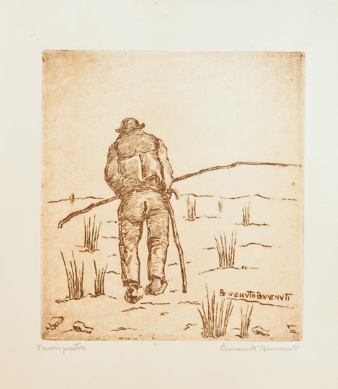 Benvenuto Benvenuti (Livorno 1881 - 1959) IL VECCHIO PESCATORE Acquaforte di cm. 24x22, su carta di cm. 34,5x30 La carta presenta lievi fioriture. Firma in basso a destra, titolo in basso a sinistra.