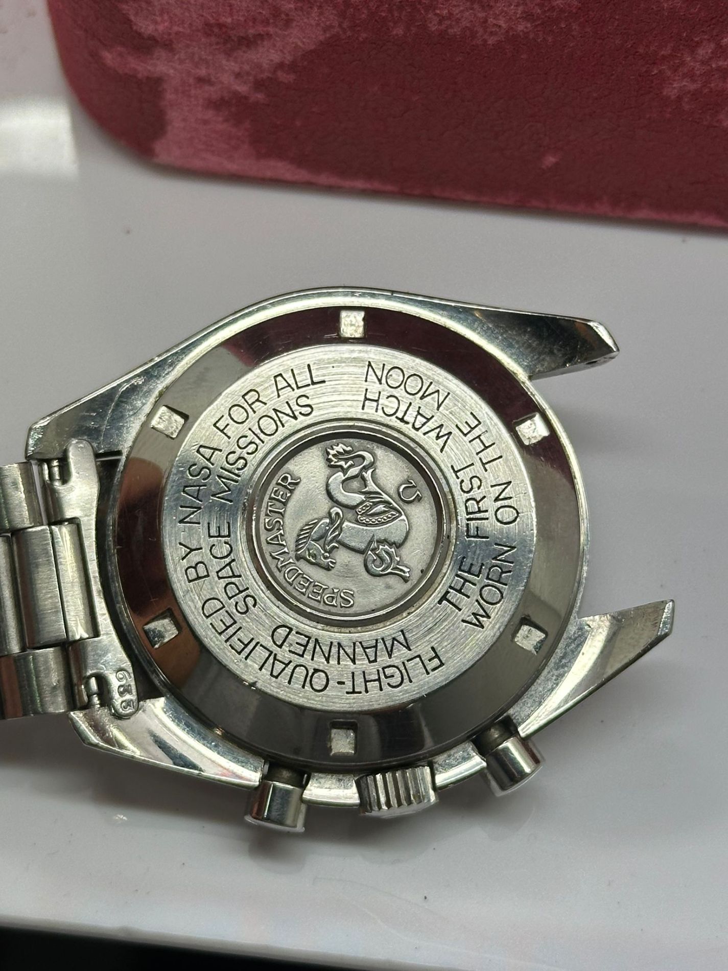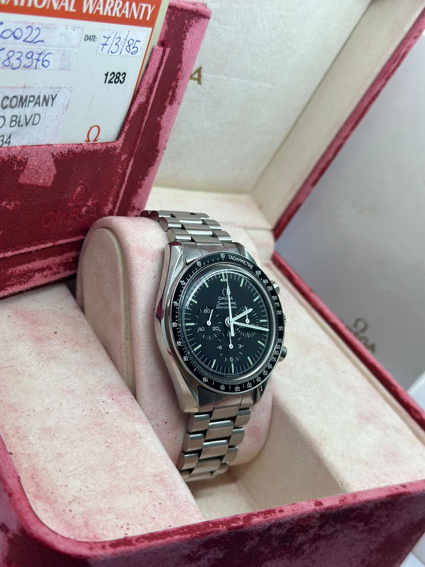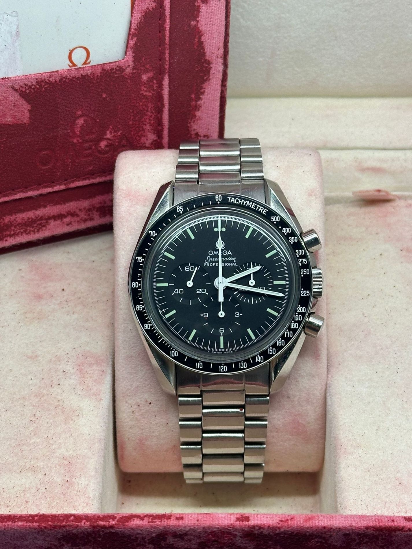 Marca Omega Modello (Orologio) Speedmaster Professional Moonwatch Numero di referenza 145.0022 Carica Manuale Materiale della cassa Acciaio Materiale cinturino Acciaio Anno di produzione 1985 Condizione Usato (Soddisfacente) L'articolo presenta segni di usura marcati ed evidenti come graffi e ammaccature. Corredo Con scatola originale e documenti originali Carica Manuale Calibro/Meccanismo 861 Calibro di base Lemania Kaliber 1873 Riserva di carica 48 h Numero delle pietre 17 Cassa Materiale della cassa Acciaio Diametro 42 mm Prova Impermeabile 5 ATM Materiale lunetta Acciaio Vetro Plexiglas Quadrante Nero Numeri sul quadrante Senza numeri Cinturino Materiale cinturino Acciaio Colore cinturino Acciaio Chiusura Déployante Materiale chiusura Acciaio Funzioni Cronografo