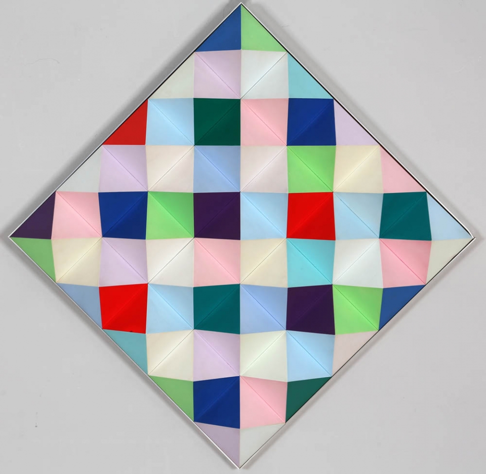 Hans Jorg Glattfelder 1939 " PYR 549 ", 1975 Piramidi con rilievi, cm. 50 x 50 x 10 Firmato e datato sul retro Timbro dell'artista sul retro Etichetta Studio F22 Palazzolo sul retro Prov. Collezione Privata