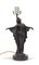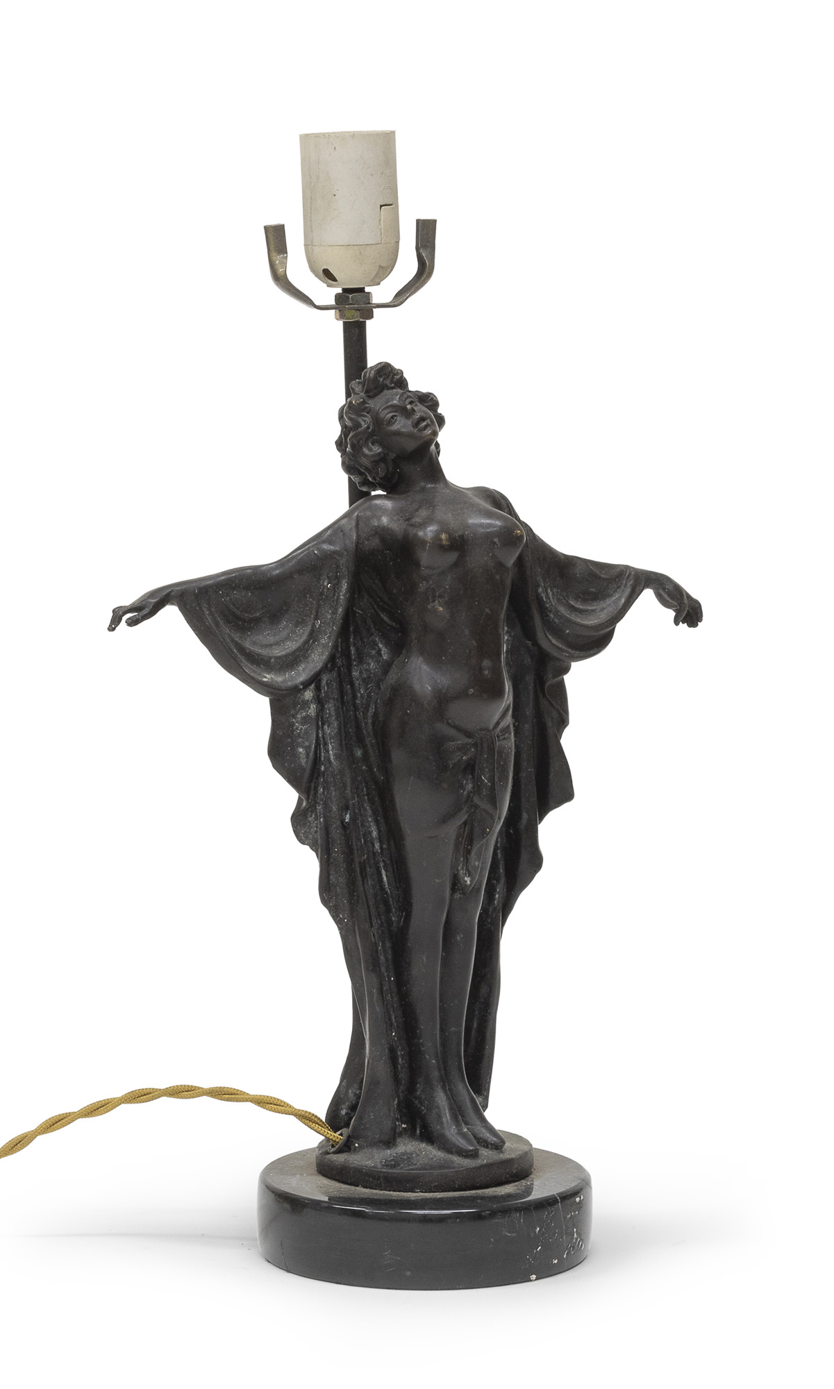 di gusto Liberty a patina nera. Fusto a figura di vestale, base a disco in marmo nero. Elettrificato.
