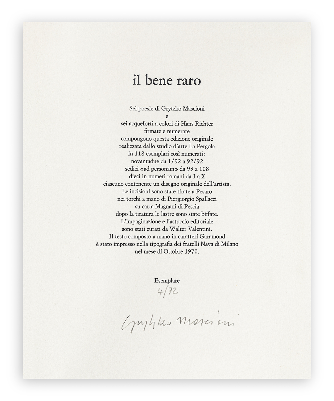 Firma di Grytzko Mascioni e numerazione (Esemplare 4/92) a matita sul colophon